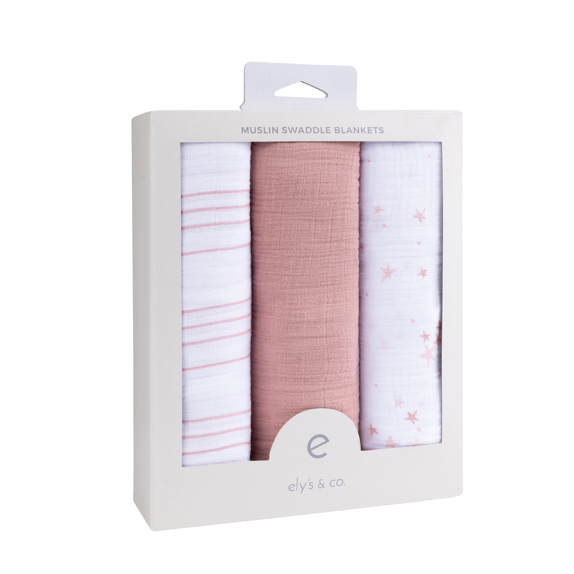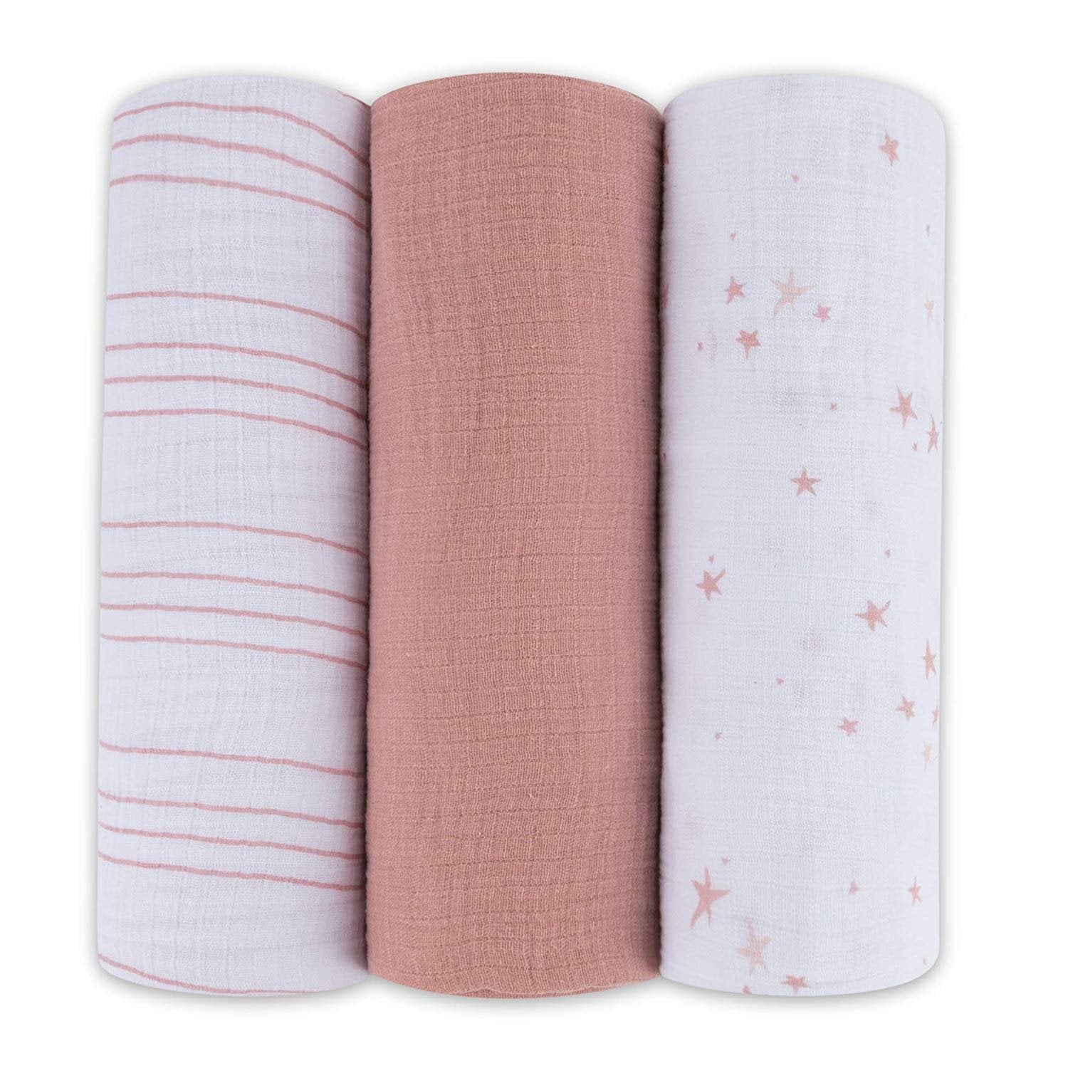 - This trio features three modern, feminine styles — classic stripes in dusty rose, shimmering stars in a mauve pink print plus a solid hue of dusty rose. These three stylishly designed swaddle blankets bundled in our gift-ready packaging make this set a perfect baby shower present for the baby girl in your life.