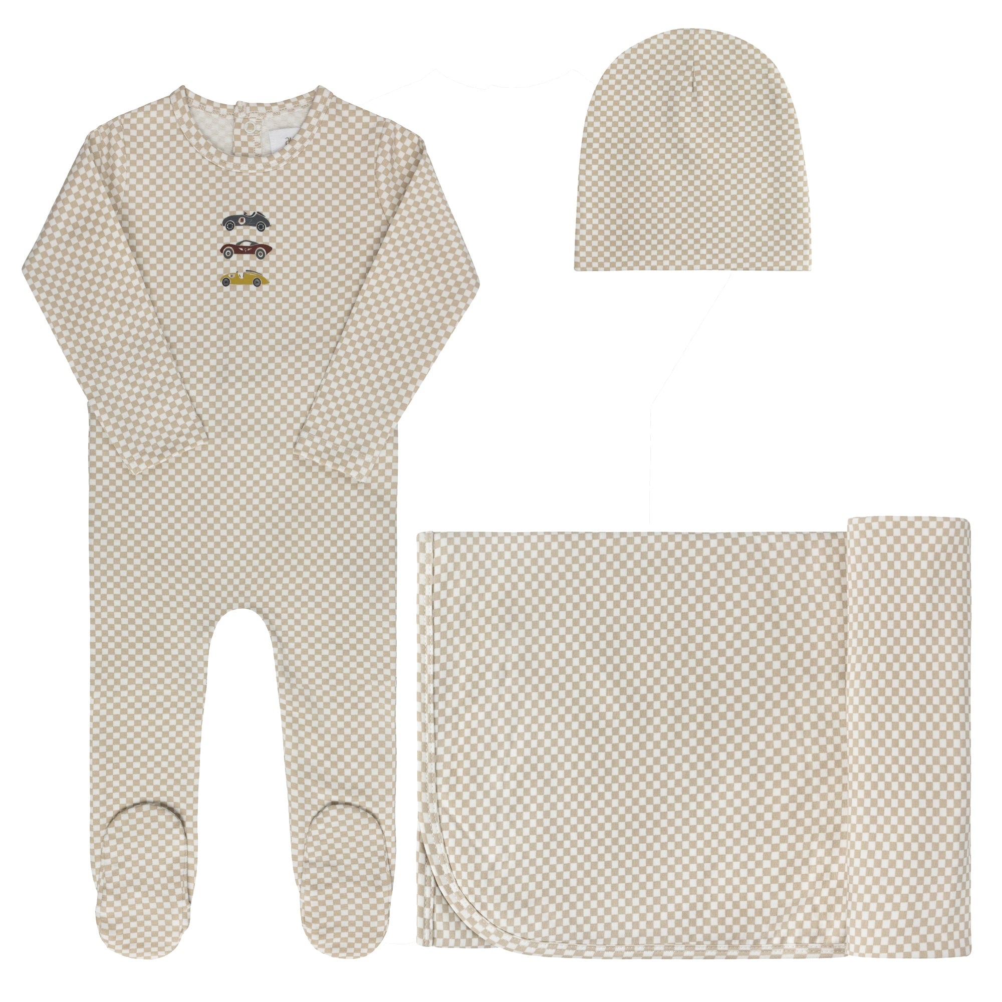 Baby Boy Layette Set – Tan – Checked Race Car