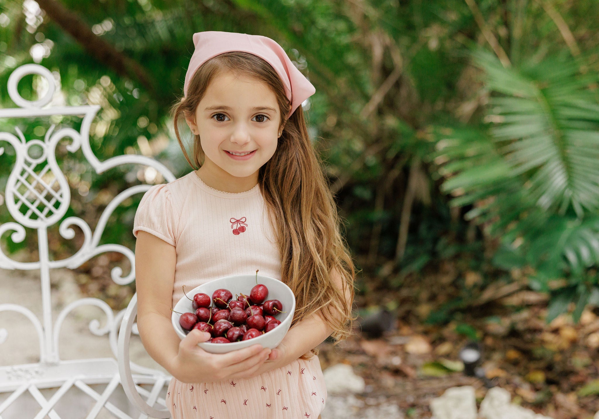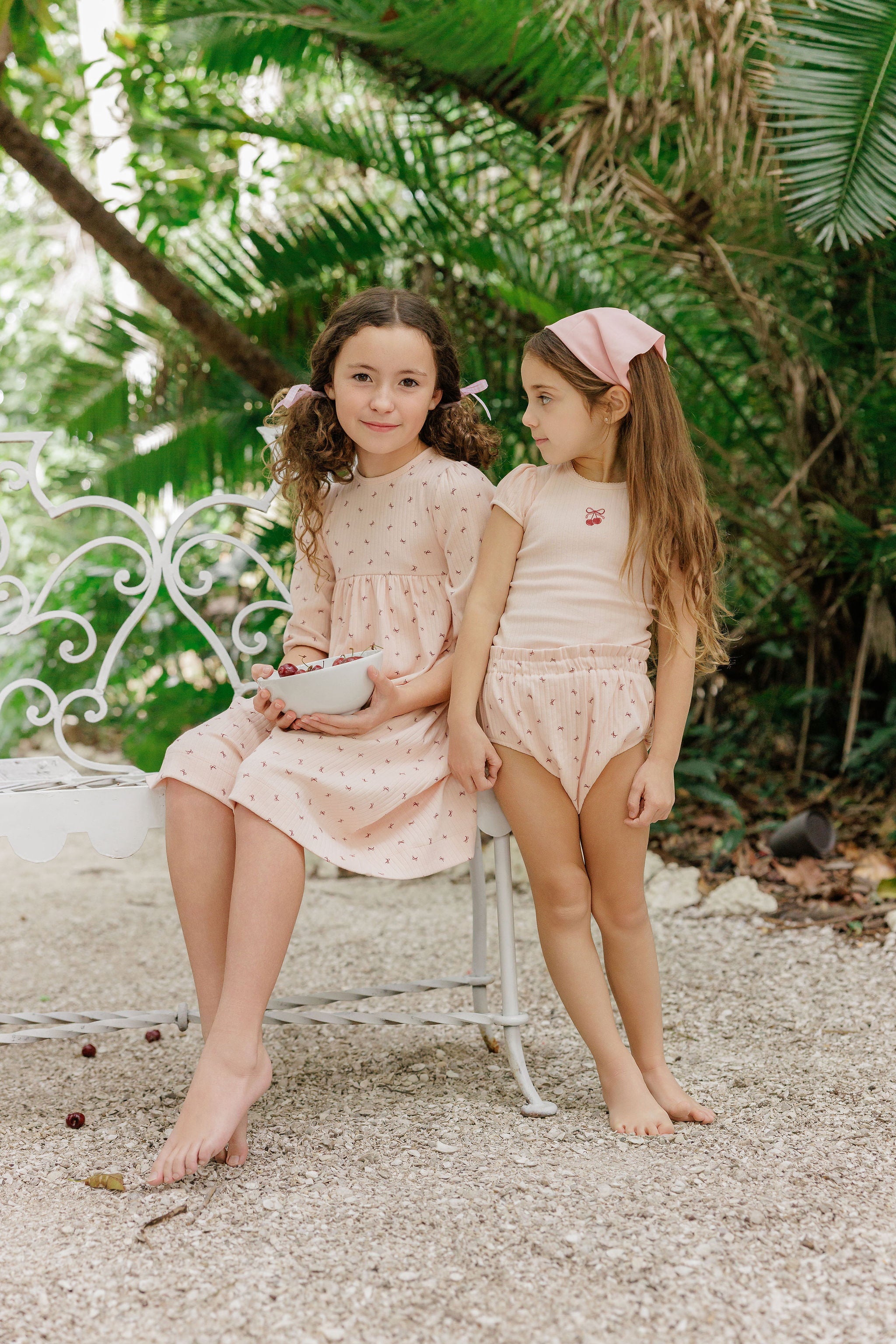 This two-piece set includes a coordinating tee and bloomer for a sweet, classic look. The top is finished with a delicate embroidered cherry bow detail, adding a polished touch to this girly outfit.