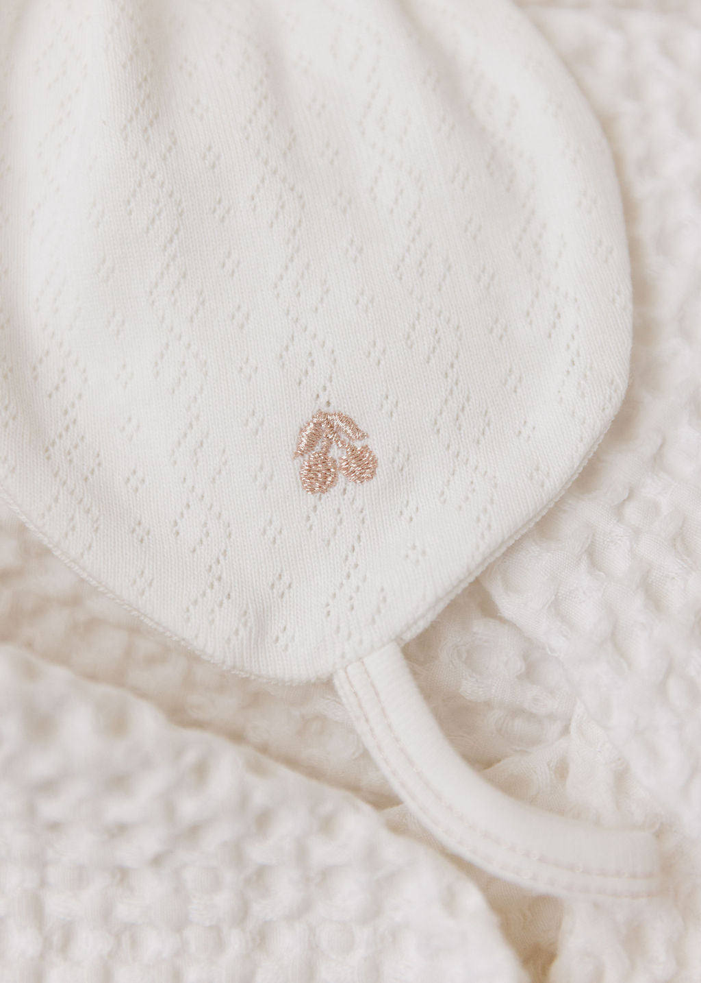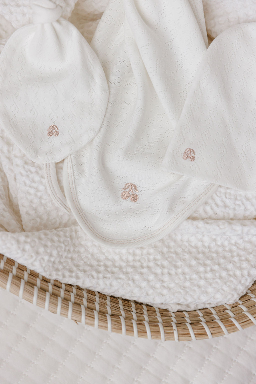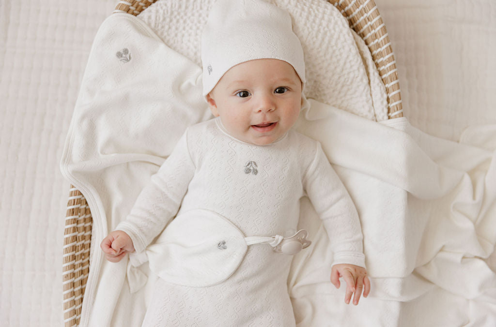 Your baby will fall in love with our Squiggle Pointelle Collection Paci Lovey! Made from soft, organic cotton and adorned with cute cherry embroidery, this convenient accessory is perfect for your little one. Say goodbye to lost pacifiers with this playful and practical baby essential.