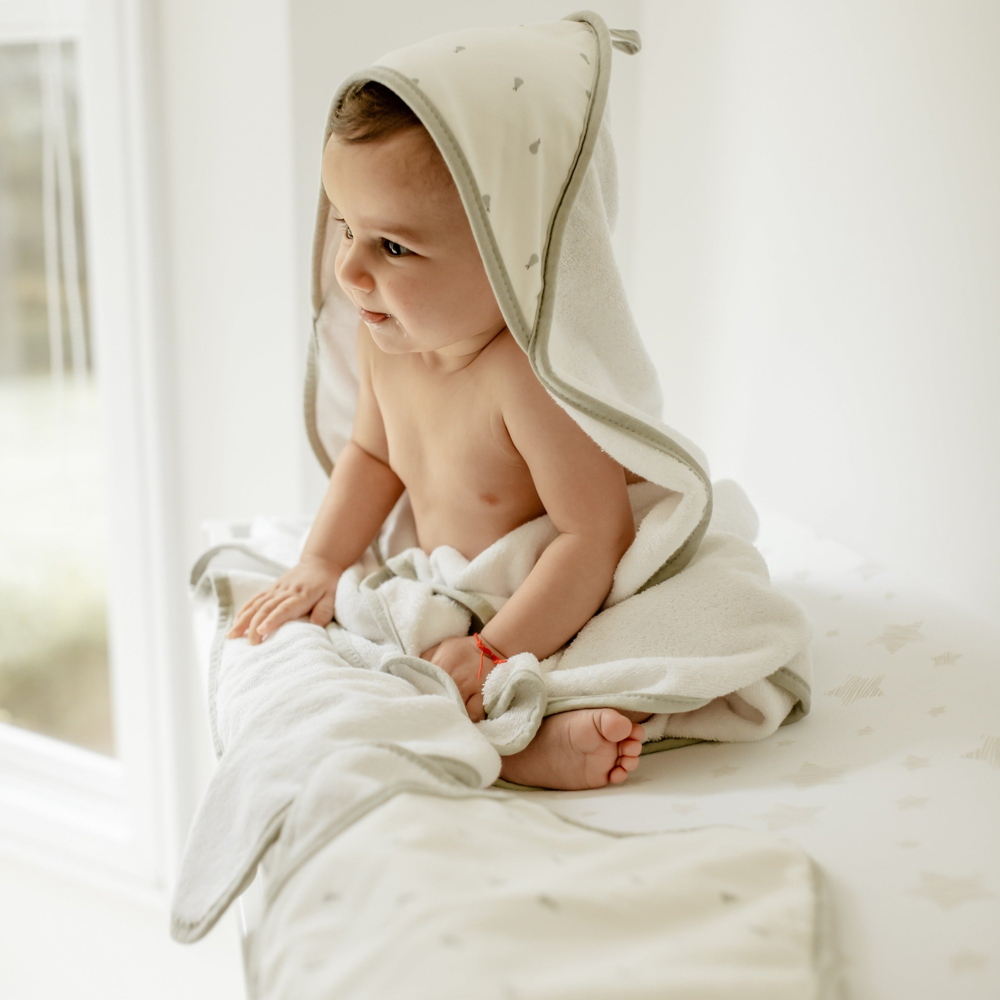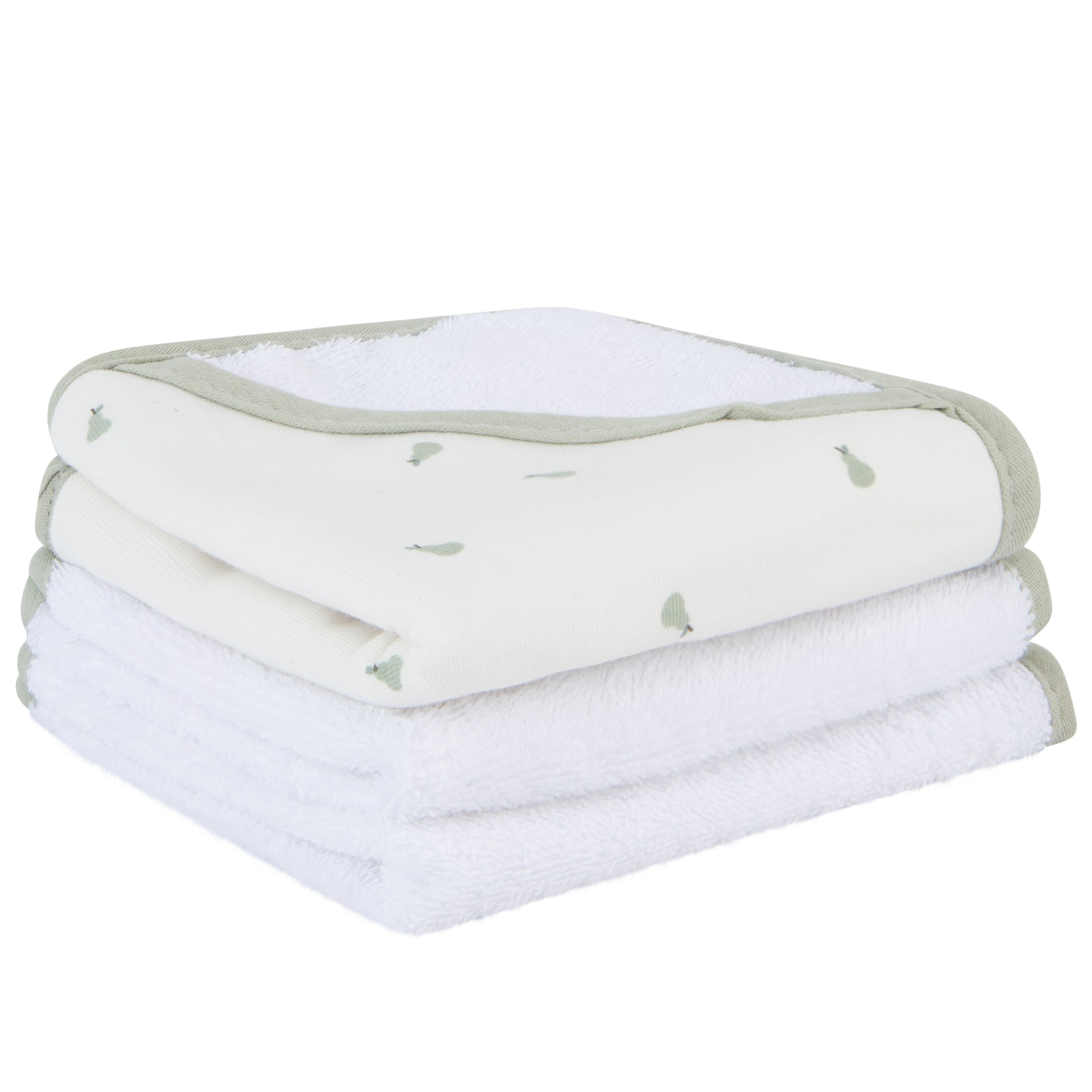 These ultra-cozy washcloths a sweet and whimsical, sage pear print on ivory jersey knit cotton embellished with a soft and neutral sage trim. Classic, comfortable and designed on-point with the latest fashion trends, this ultra-absorbent bath set is a must-have addition to your Baby Registry and modern décor.