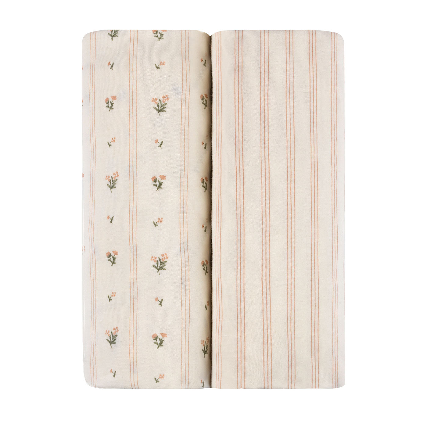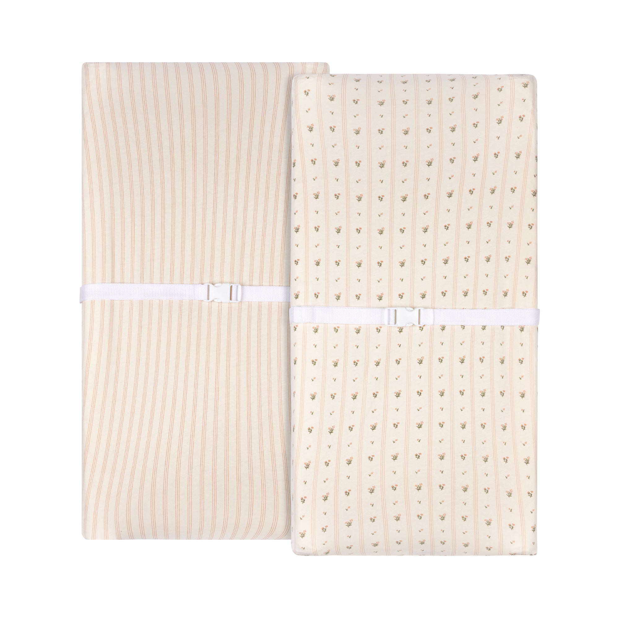 - Flexible-Fit Changing Pad Cover 2-Pack for Baby Girl in Linear and Floral Print Design – Bundled in our charmingly cute and compact packaging, this set makes for the perfect baby shower gift!