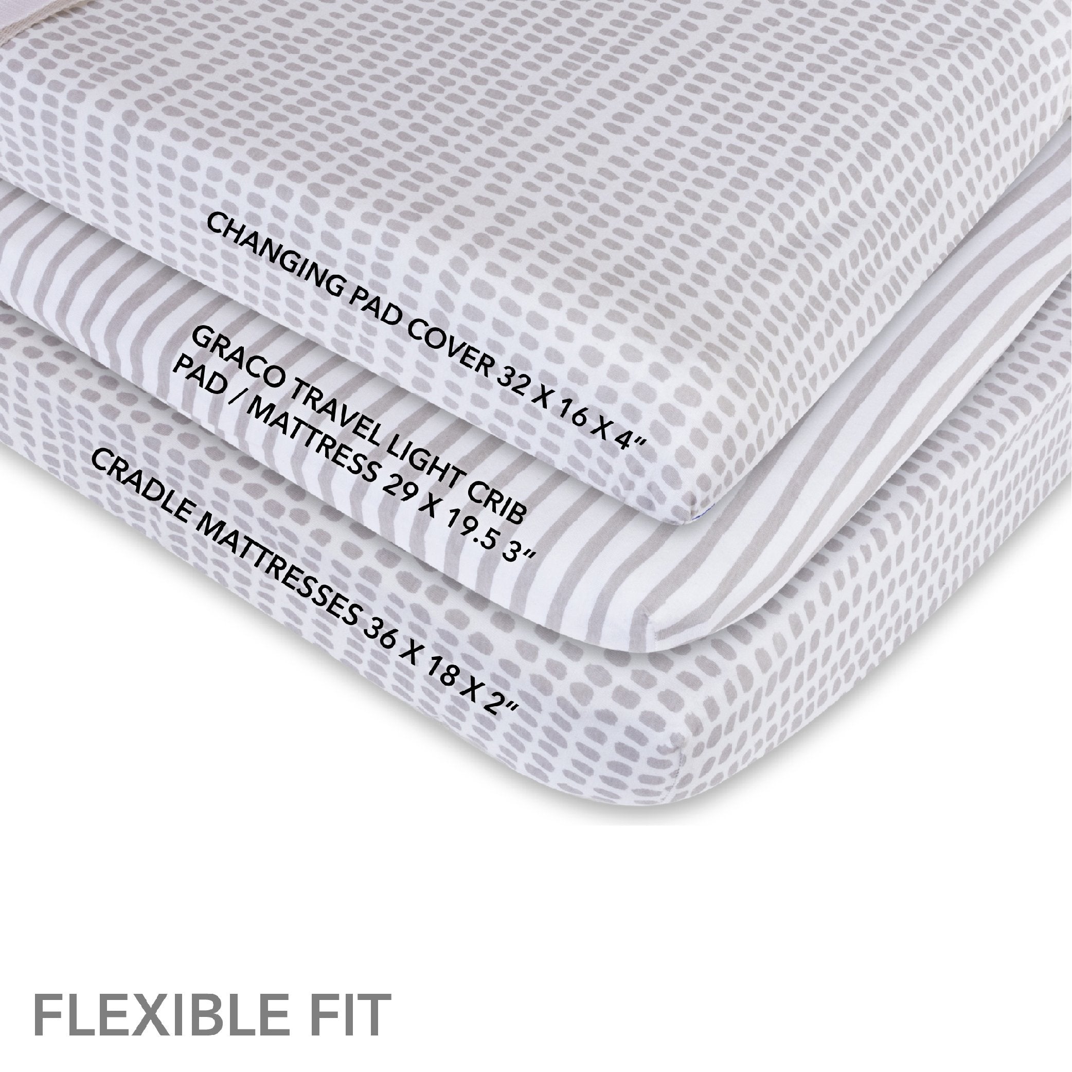 Flexible Fit: Perfect for Changing Pads and Cradles Our universal fit allows most standard changing pads, as well as cradle mattresses size 36" x 18", to be snugly ensconced in our superior product. With a uniquely designed, flexible and generous elastic, our sheet set easily covers your mattress while simultaneously offering a tight seal, enabling a great fit on multiple sized mattresses.