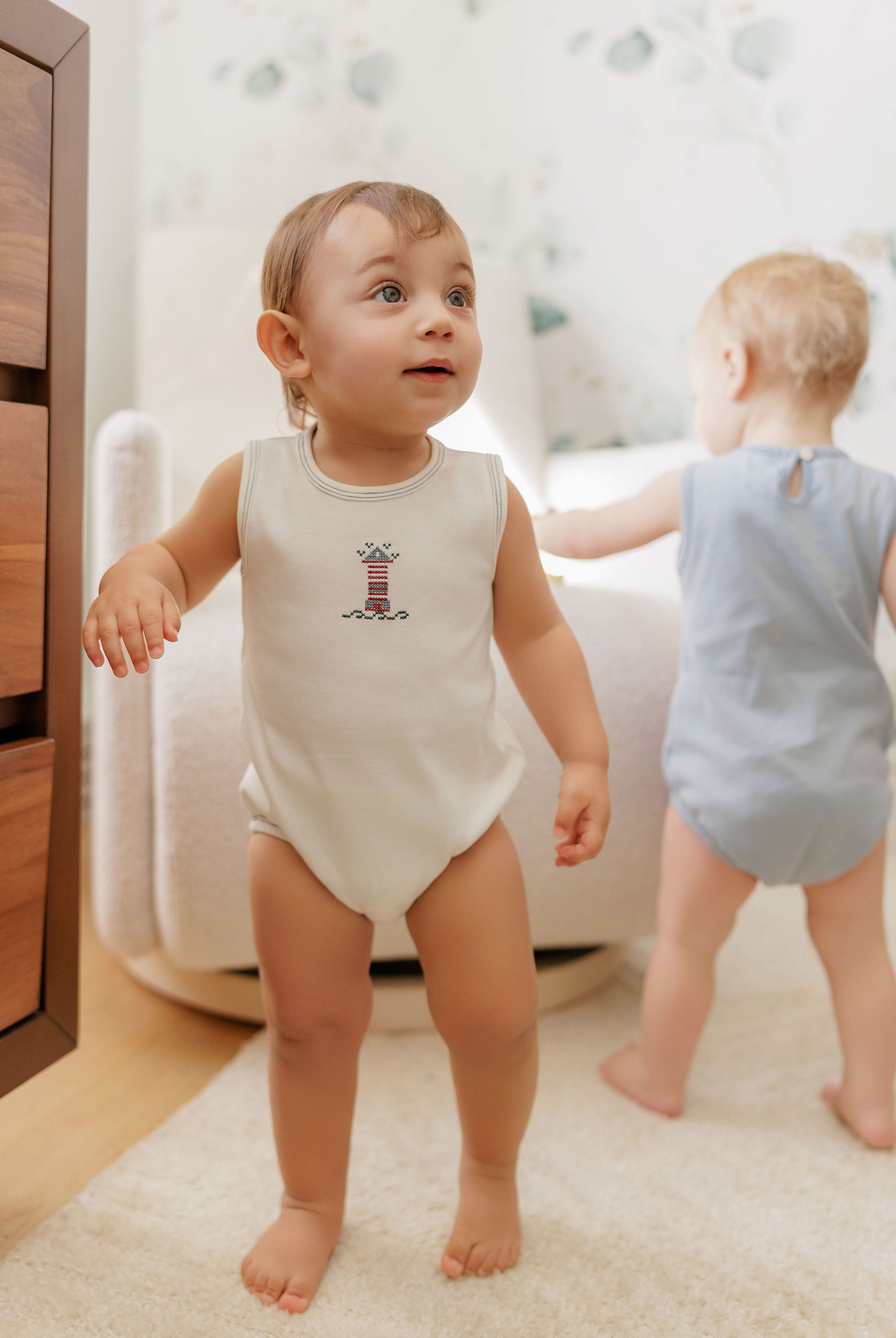 Inspired by traditional hand stitching, the Cross Stitch Tulip/Lighthouse Collection brings quiet character to baby's wardrobe. Crafted in soft stretch cotton, each piece blends everyday comfort with timeless detail.