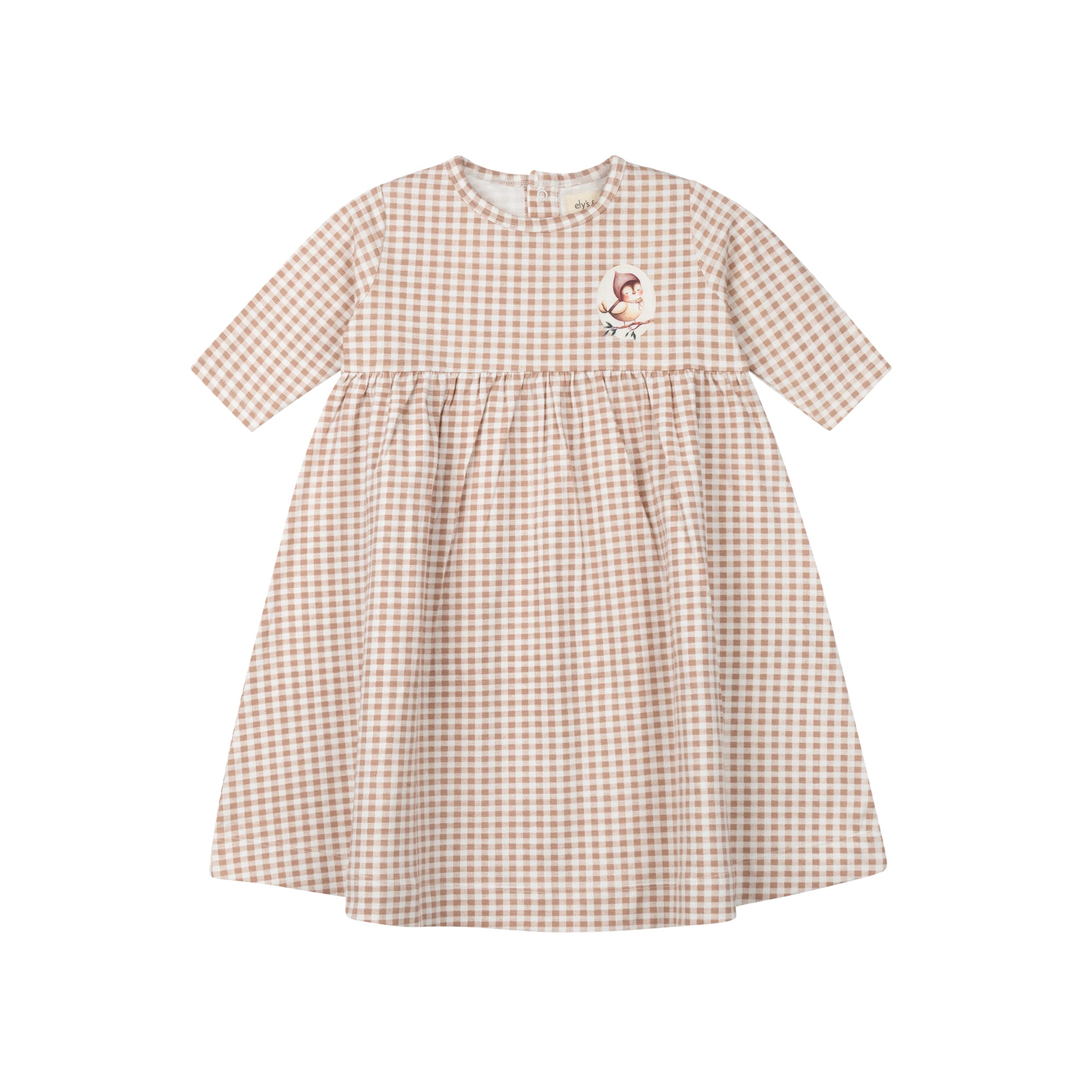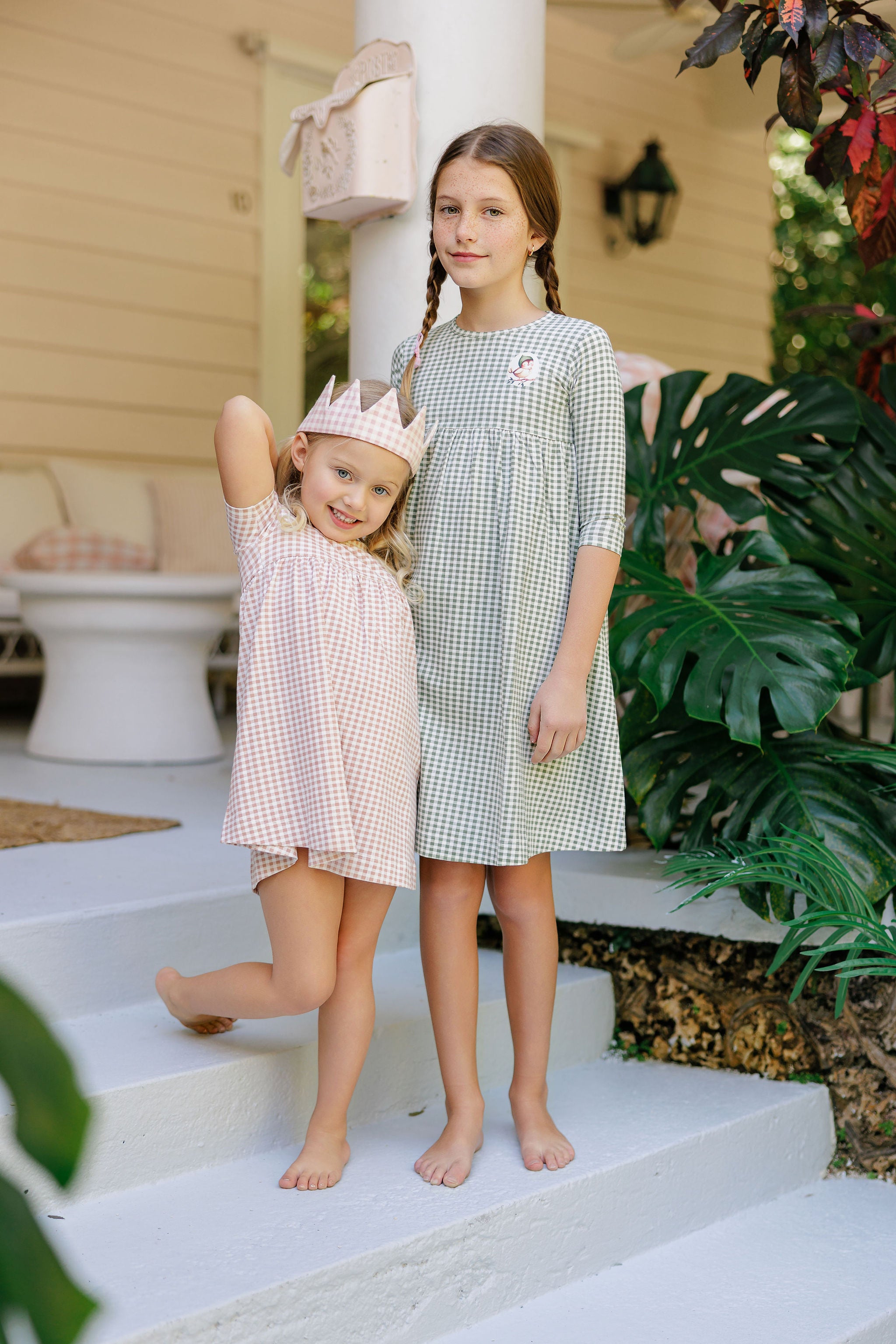 This gingham dress features the signature owl patch for a sweet statement silhouette in blush or sage.