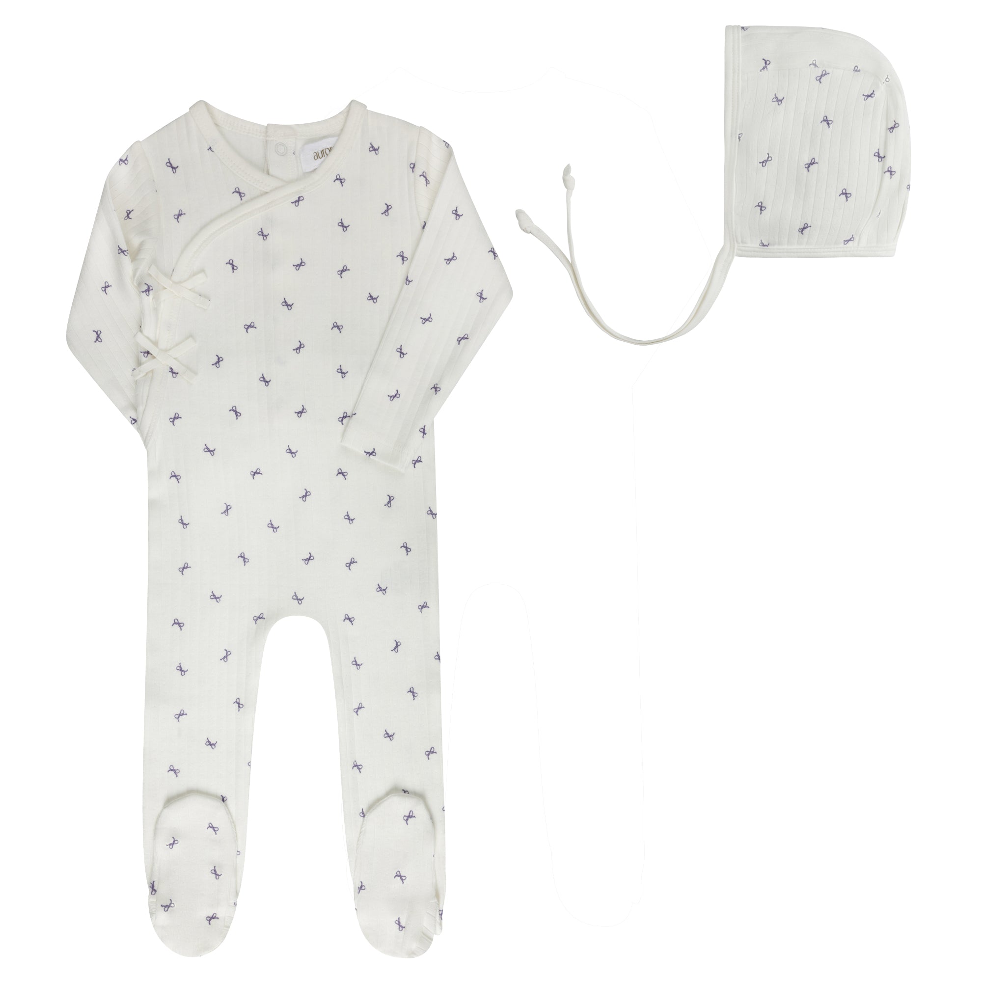 Baby Girl Footie and Bonnet – Ivory Lilac – Bow Pattern