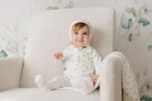 This kimono-style footie (Stretchy) features a wrap-inspired neckline with snap closures and is finished with a delicate bow detail. Comes with a coordinating bonnet for a complete, beautifully styled layette set — the perfect take me home set —.