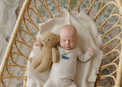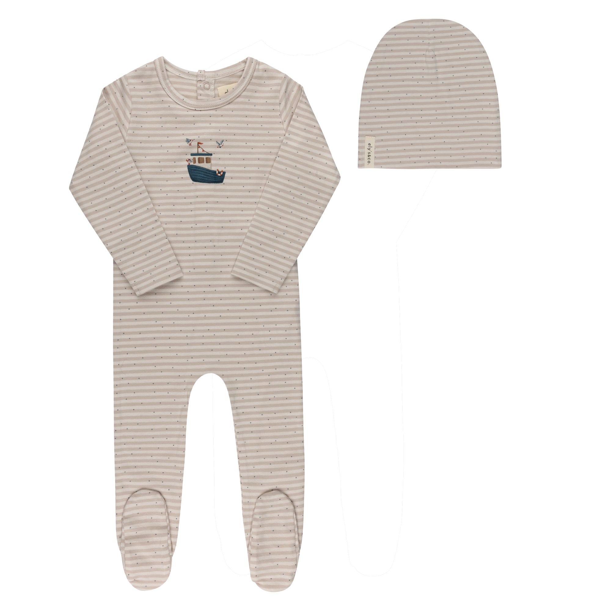This baby footie (Stretchy) comes with a coordinating striped beanie and a classic sailboat detail at the chest.