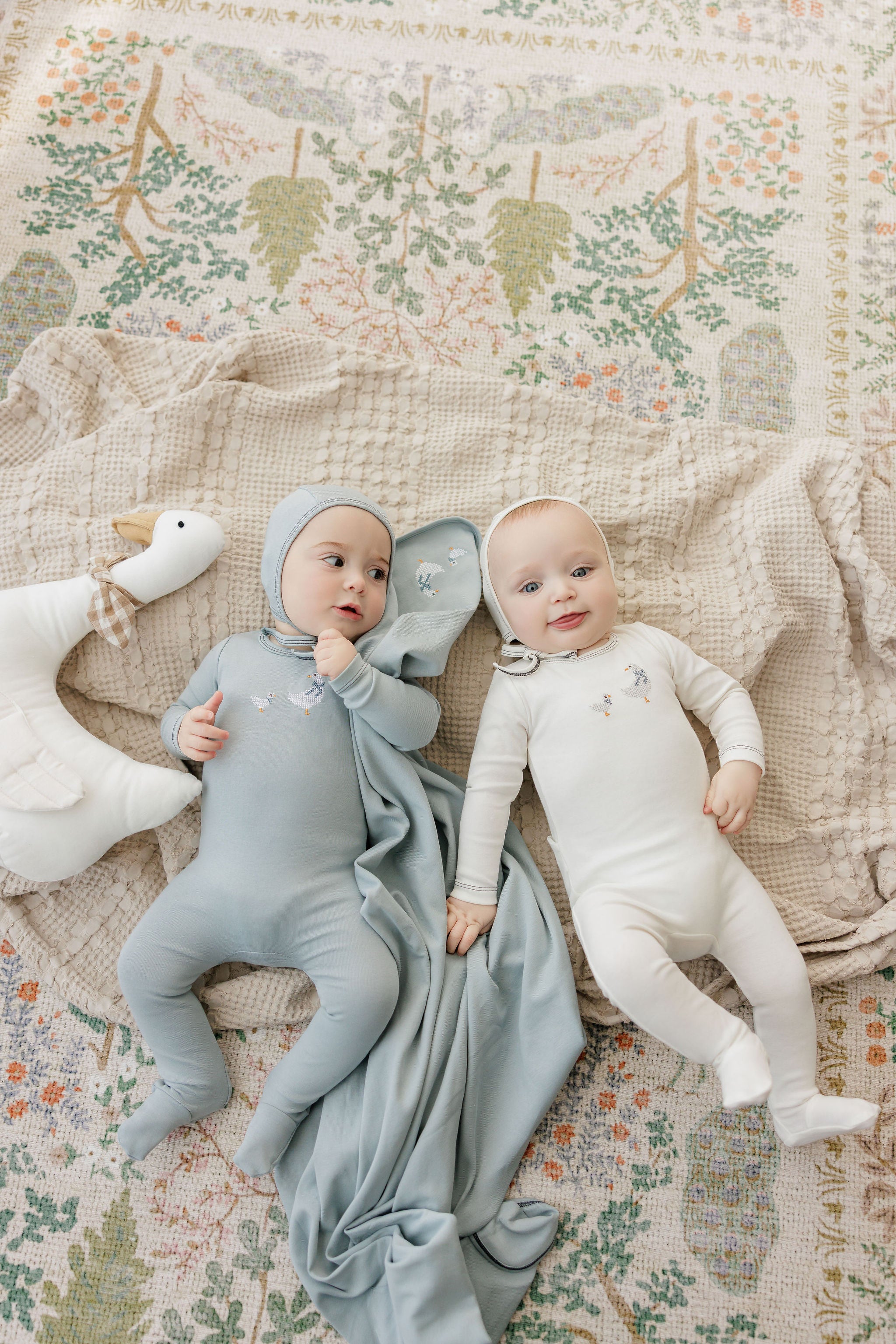 Sweet and timeless, the Cross Stitch Duckling Collection features delicate cross-stitch inspired duck embroidery on soft, classic silhouettes. Designed in gentle, muted tones, each piece feels charming, cozy, and quietly heirloom-inspired.