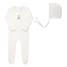 This baby footie (Stretchy) comes with a coordinating bonnet for a complete baby outfit.