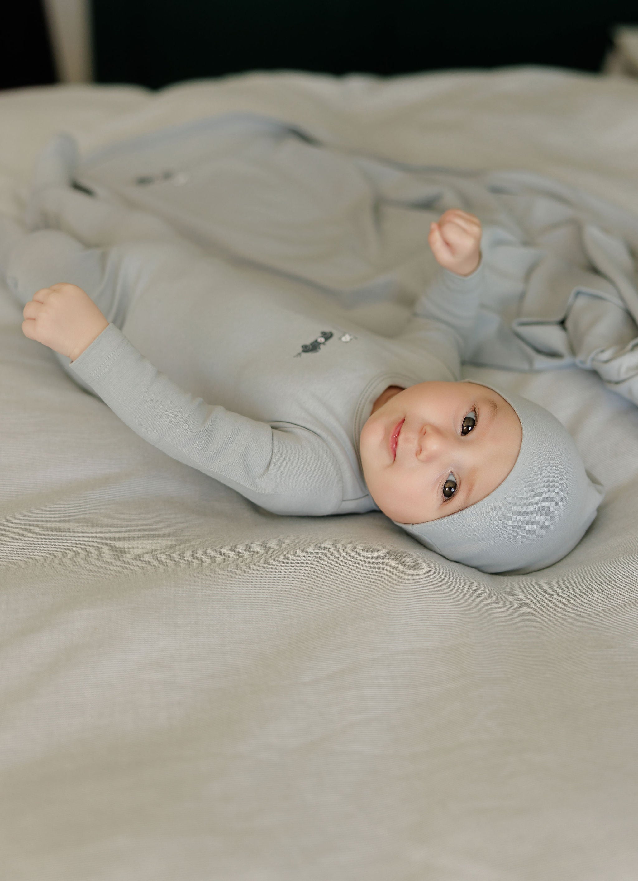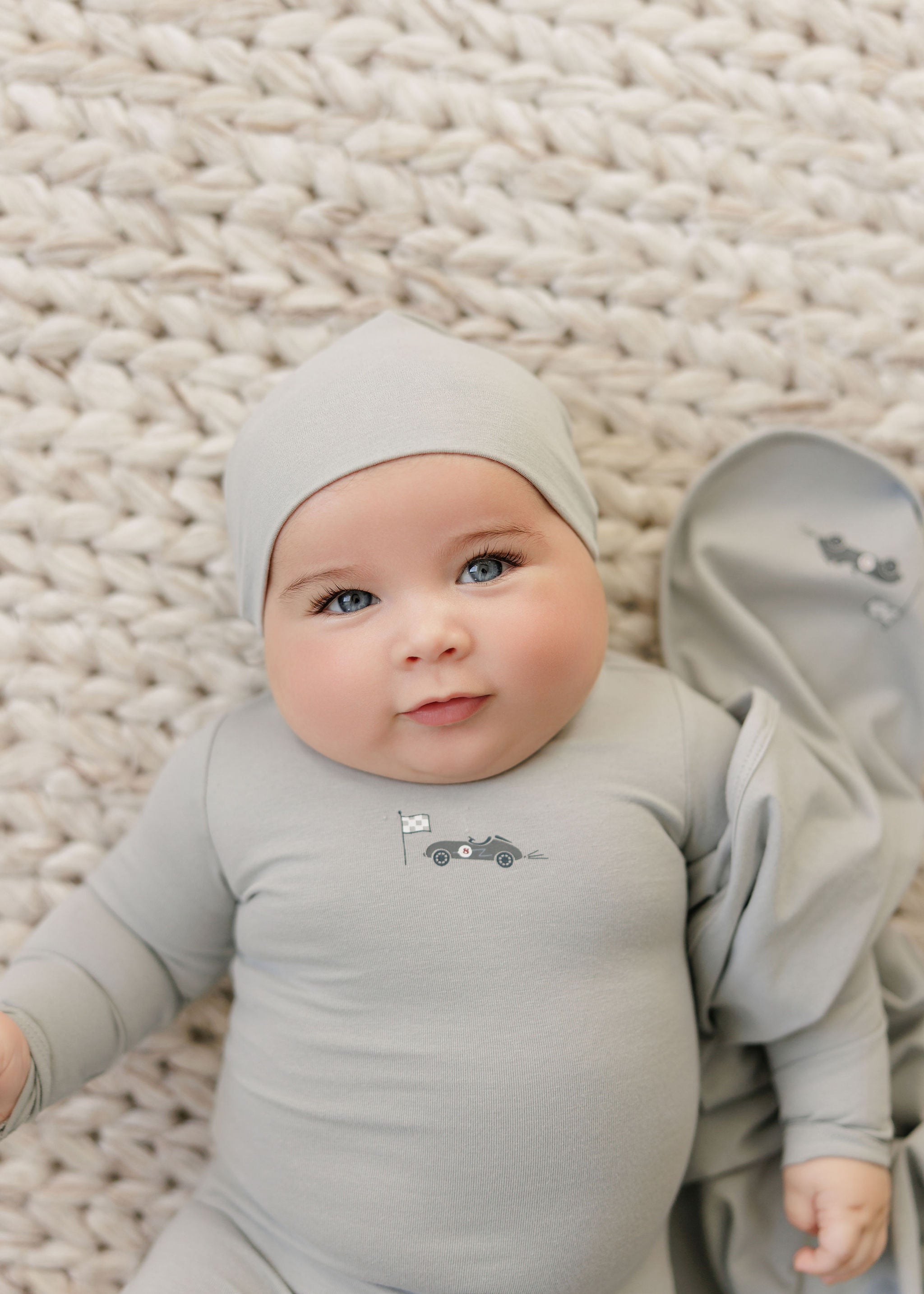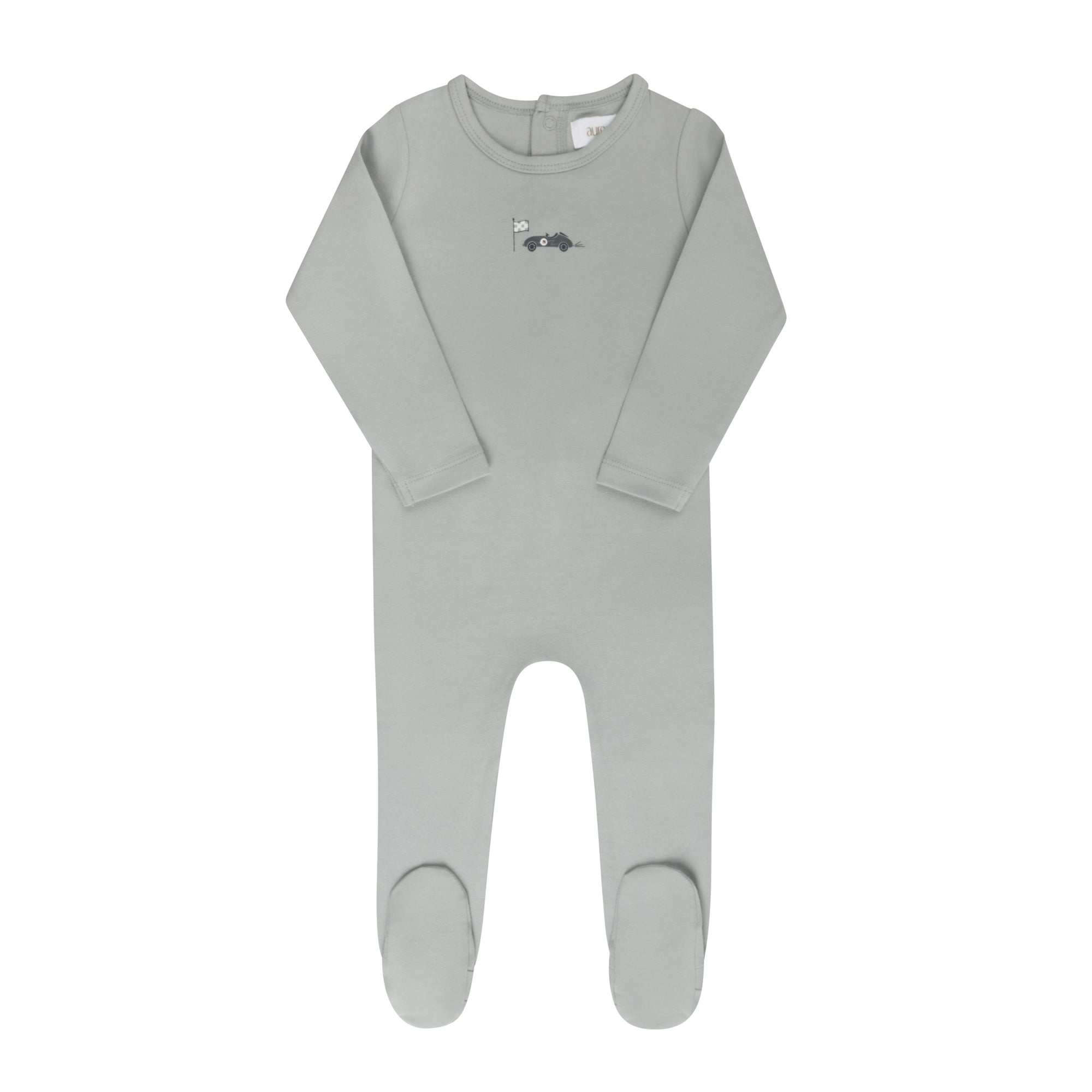 This standard footie (Stretchy) features a clean solid base with a single race car and flag motif for a sweet, sporty touch. Crafted in soft stretch jersey with snap closures for easy changes, it keeps baby comfortable while adding playful personality.