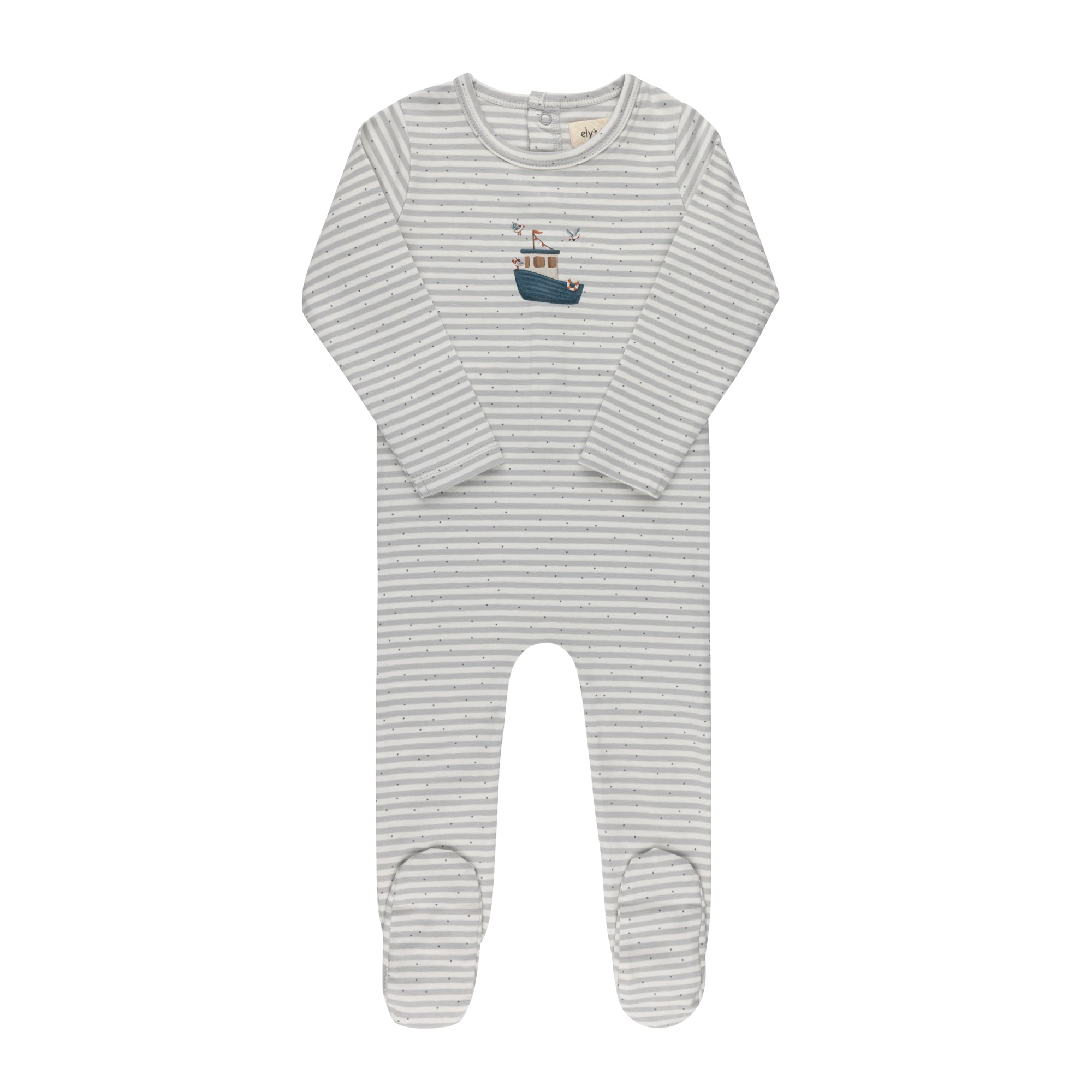 This baby footie (Stretchy) features a classic sailboat detail at the chest in our soft striped stretch cotton.
