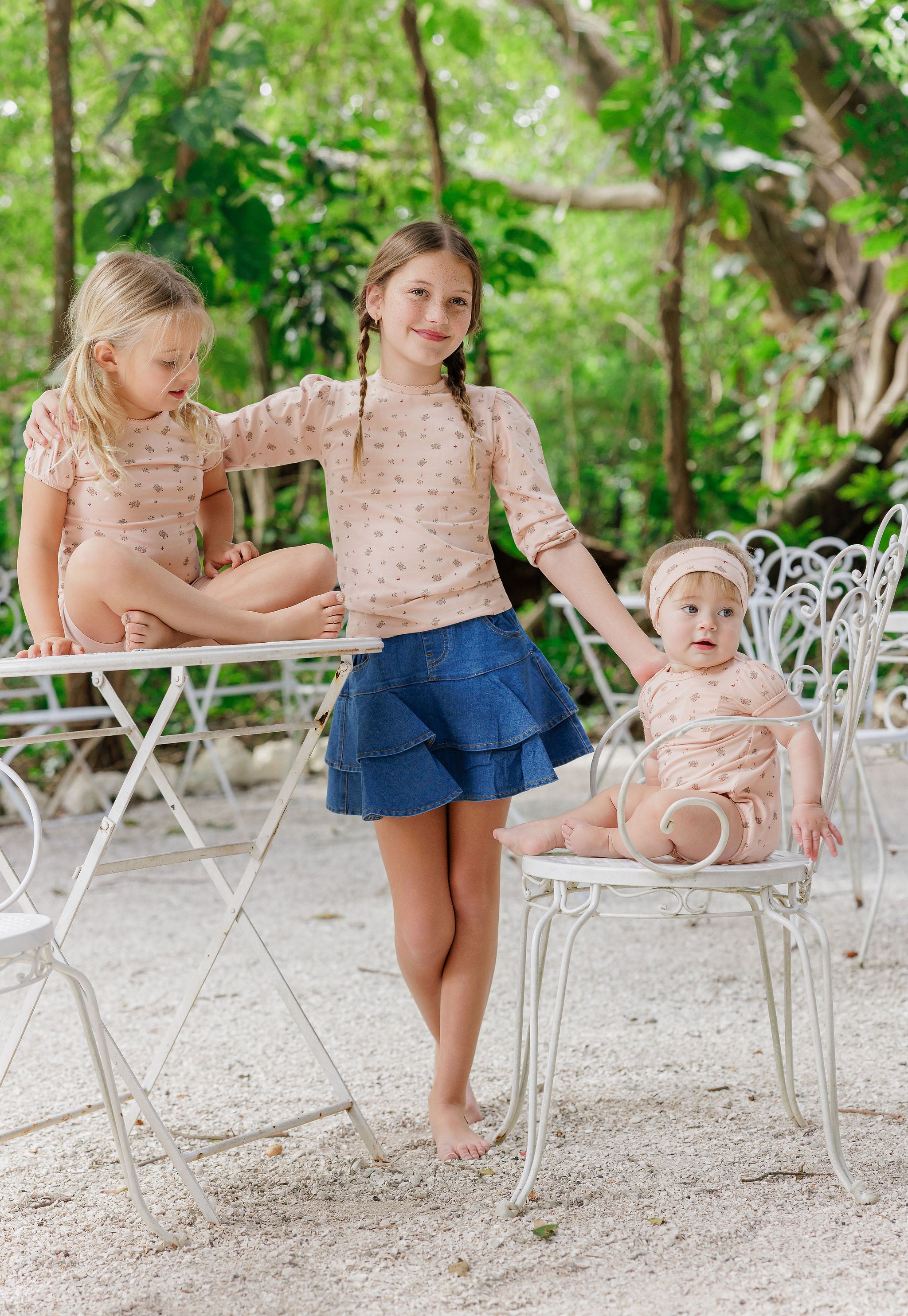 The Floral Print Collection is defined by its soft, feminine floral and graceful color palette. Made in stretch jersey and coordinated across ages, the pieces are perfect for mixing and matching, blending everyday comfort with timeless, girly charm.