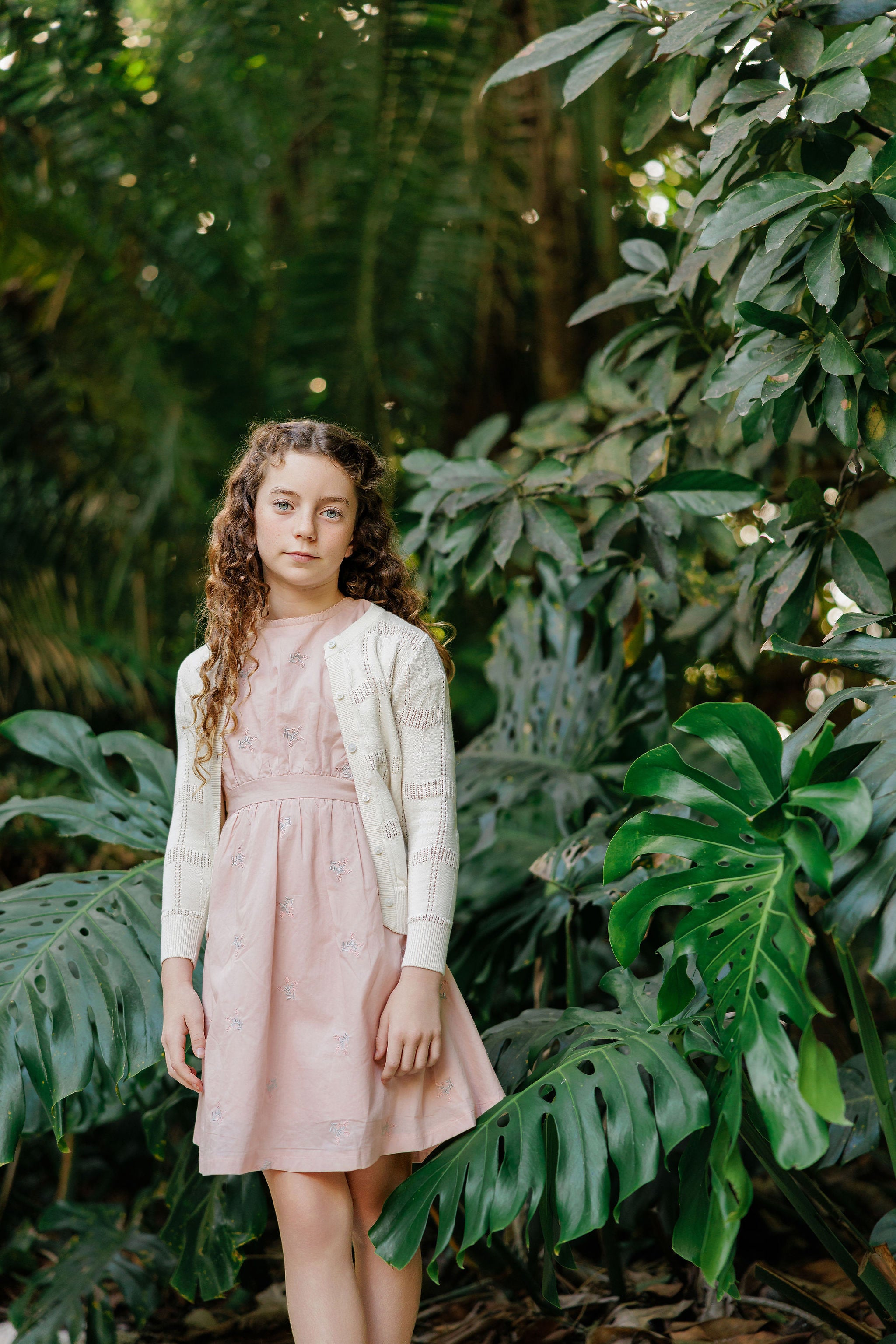 This woven cotton dress is finished with beautiful embroidery for a timeless look. Pair it with the wave knit cardigan from this collection for a complete finish.