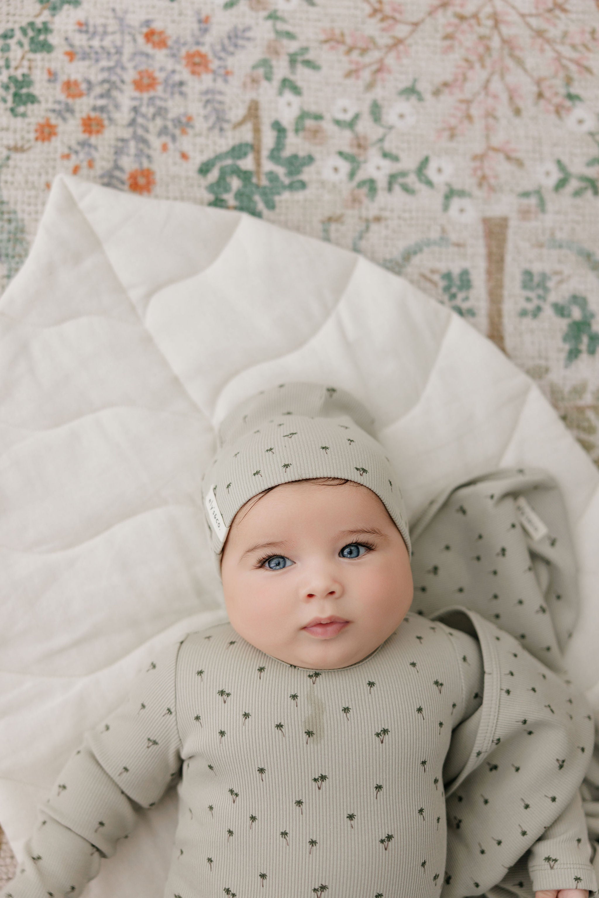 This baby layette set — the perfect take me home set — includes a coordinating footie (Stretchy), matching bonnet, and blanket in the all-over palm print.