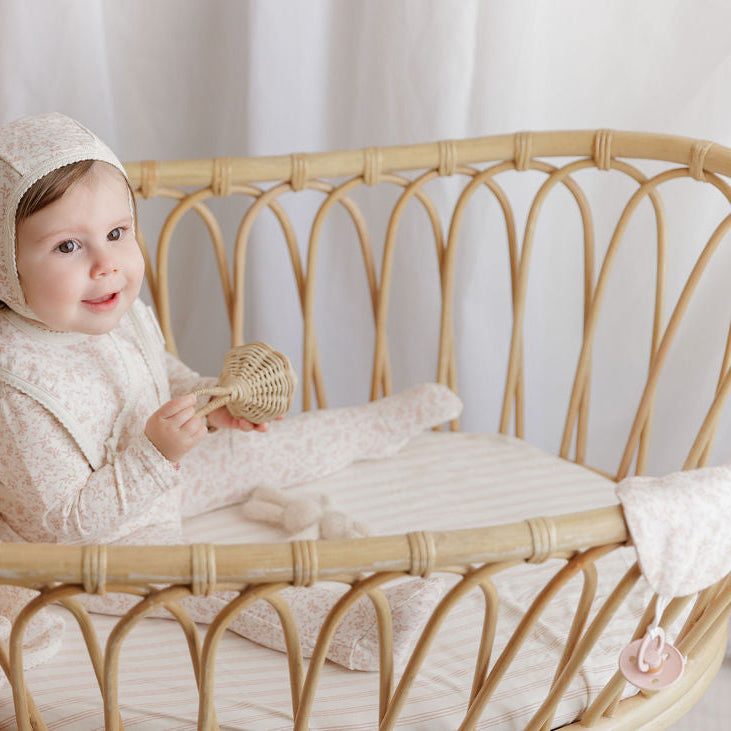 Soft and comforting, the Modal French Terry Vine Collection Muslin Paci Lovey is perfect for soothing your baby. Crafted from breathable modal French terry and gentle muslin, it offers a cozy touch that helps calm and comfort little ones. Its lightweight design makes it easy to carry, providing a familiar, cuddly companion wherever you go. Ideal for naps or quiet moments, this lovey combines quality materials with thoughtful design to support your baby's comfort and security.