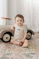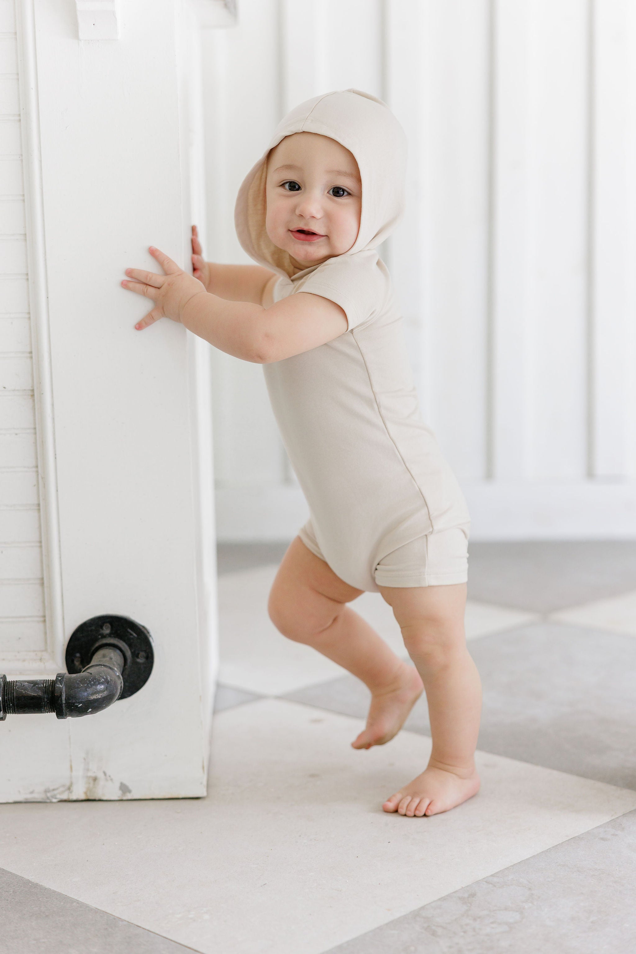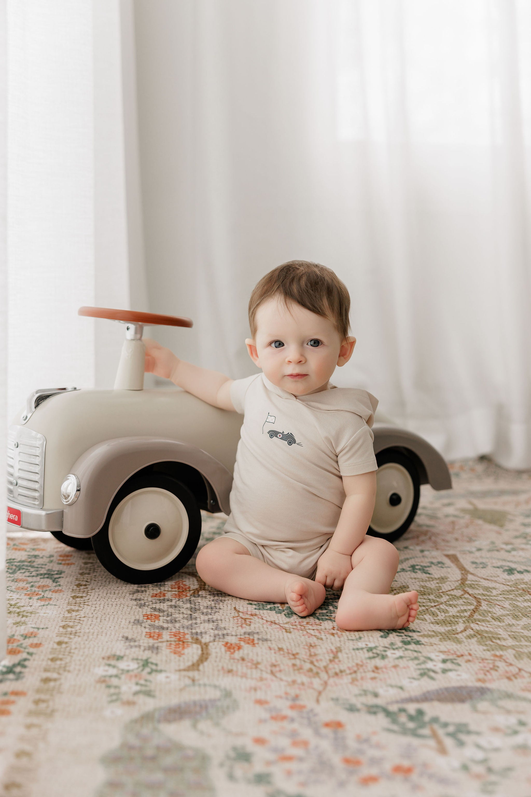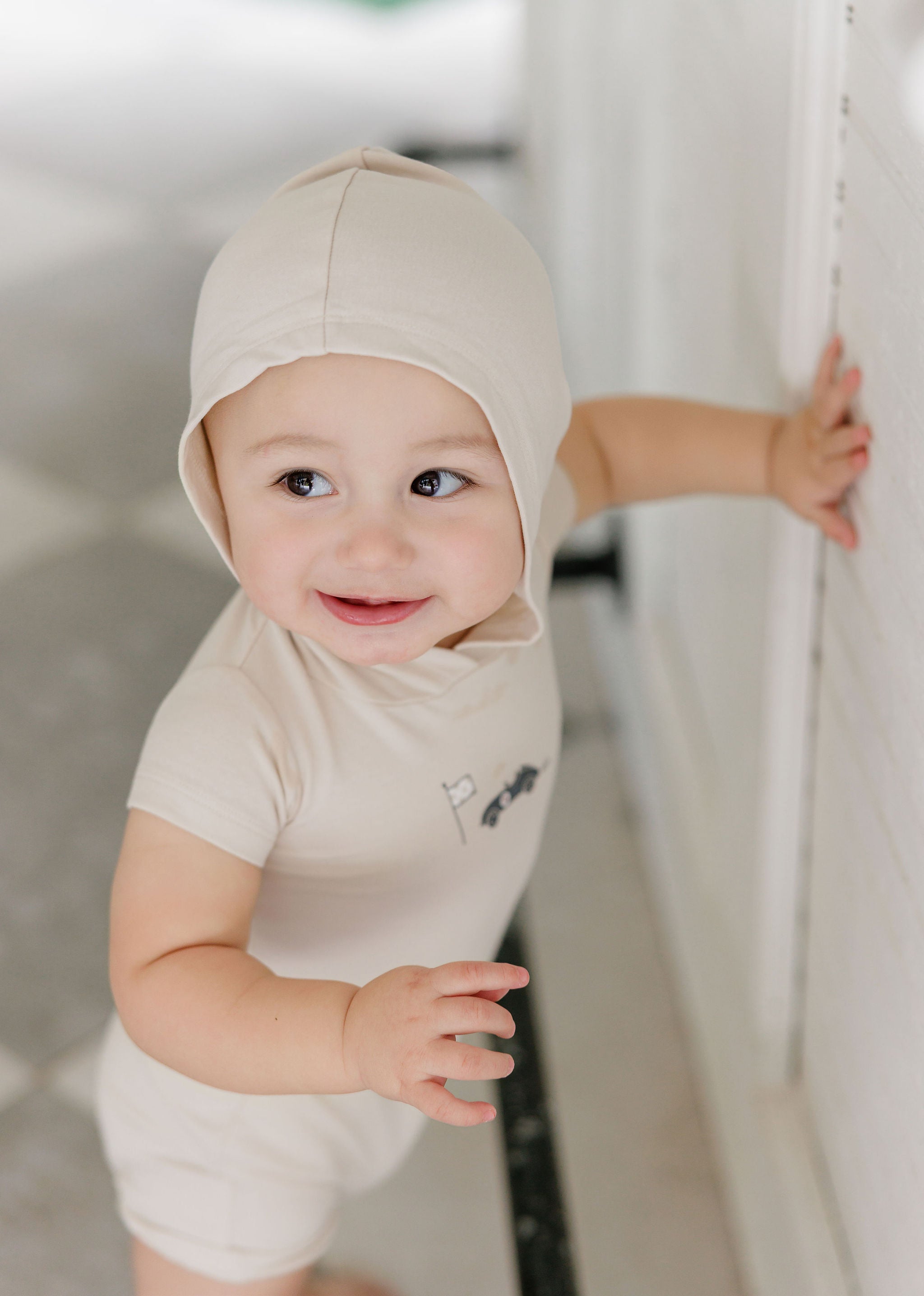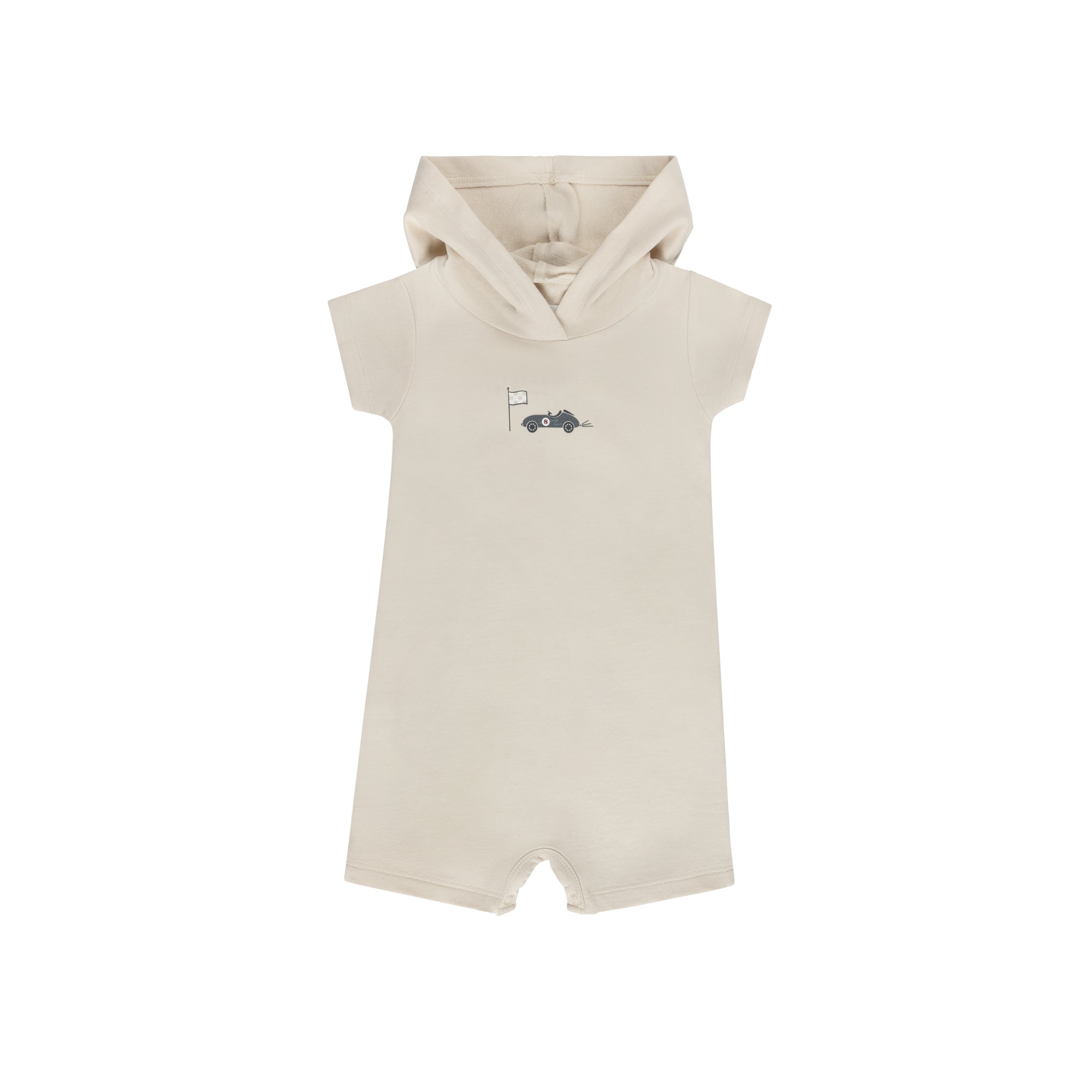 This toddler romper features a sporty hood and a single race car motif for a playful, boyish touch. Crafted in soft stretch jersey for comfort and easy movement, it is perfect for active, warm-weather days.