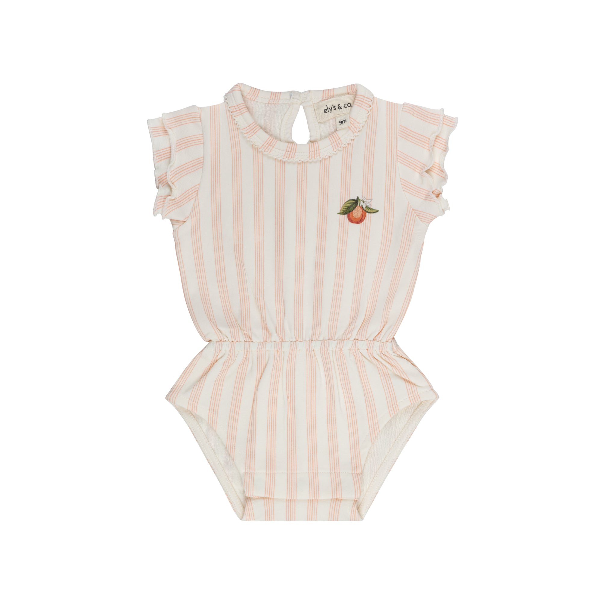 This baby romper features a delicate printed peach motif for an easy, warm-weather look.