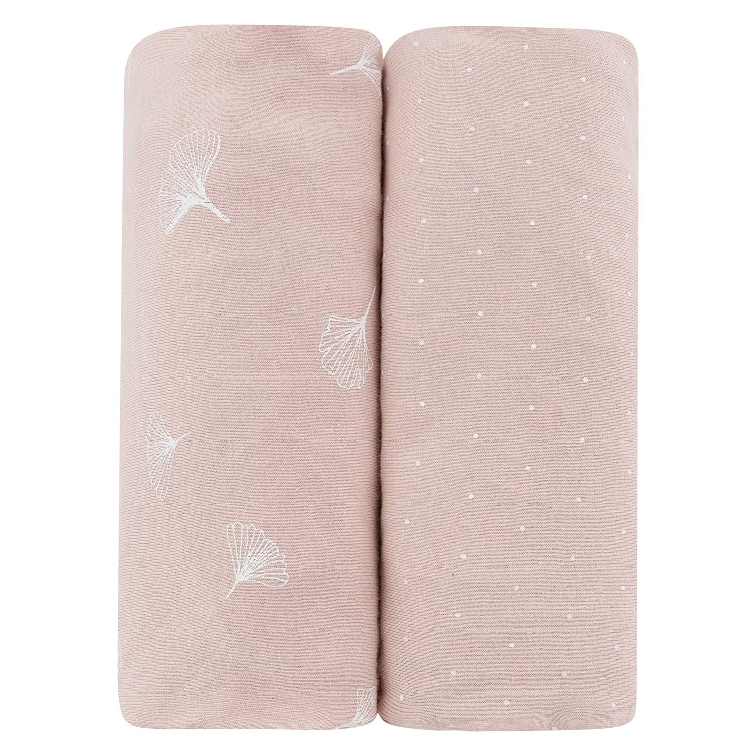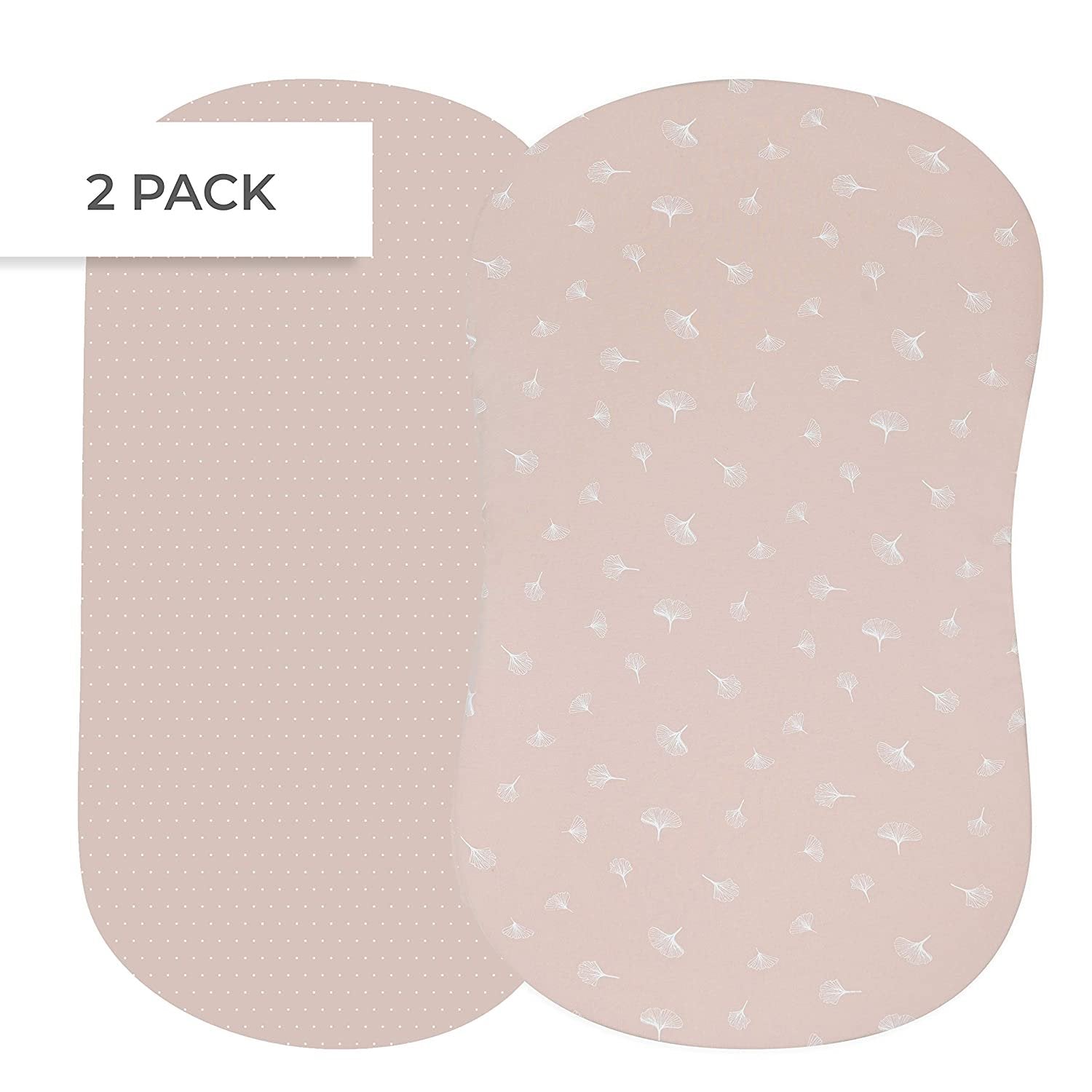 - Flexible-Fit Bassinet Sheet 2-Pack for Baby Girl in Rosewater Pink with Pin Dot and Gingko Leaf Designs– Bundled in our charmingly cute and compact packaging, this sheet set makes for the perfect baby shower gift!