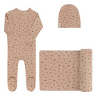 This baby layette set — the perfect take me home set — includes a coordinating kimono-style footie (Stretchy), matching beanie, and blanket. The footie (Stretchy) is finished with two sweet bows for a beautifully delicate presentation.