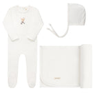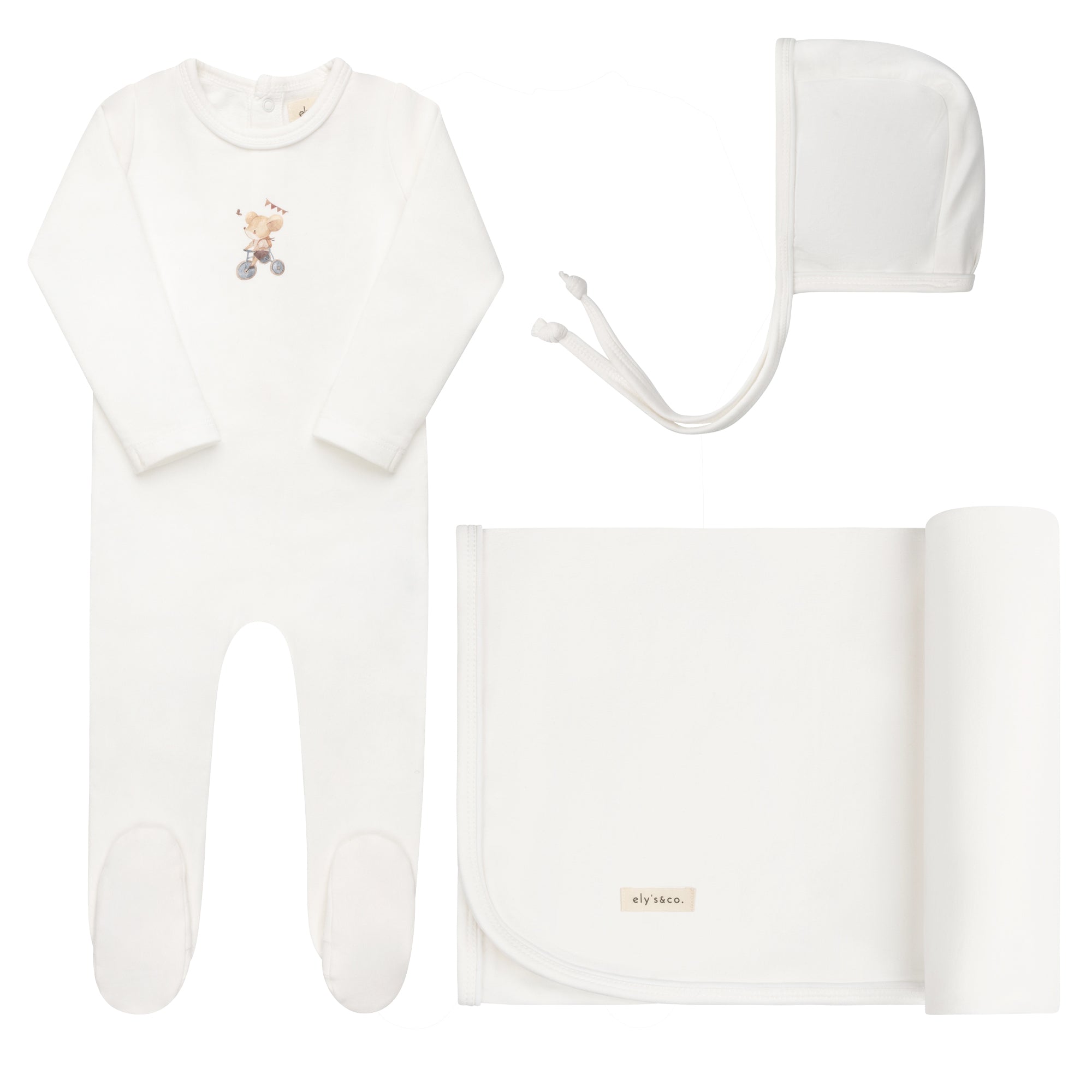 This baby layette set — the perfect take me home set — includes a coordinating footie (Stretchy), matching bonnet, and blanket for a beautifully complete look.
