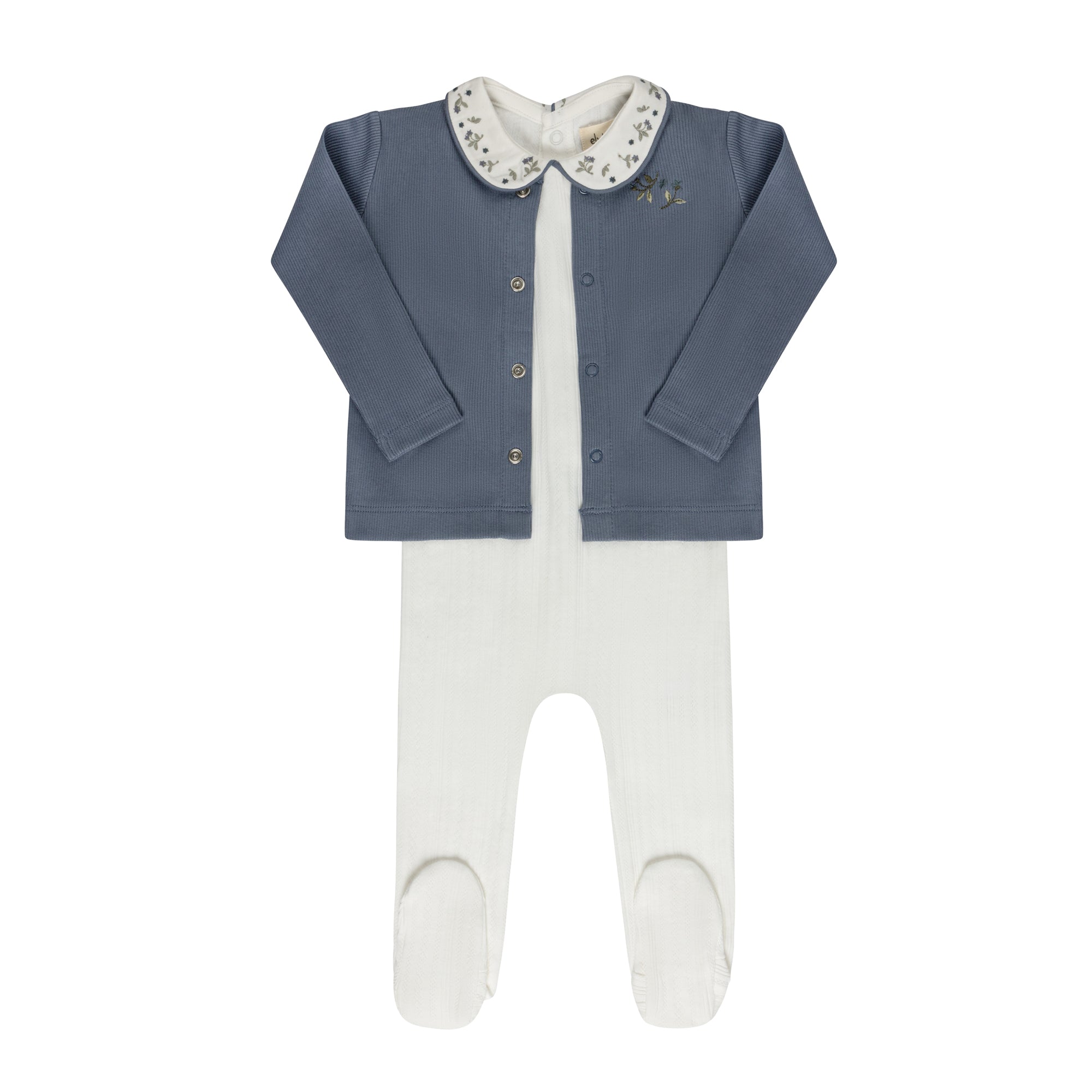 Baby Boy Footie and Bonnet – Ivory Blue – Embroidered Collar