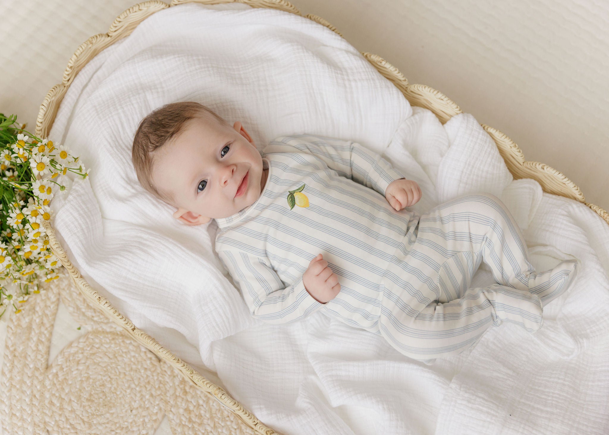 Sun-kissed and sweet, the Lemon Peach Collection features soft vertical stripes with delicate printed lemon and peach motifs. Designed in a lightweight, breathable blend, this collection brings effortless summer charm to coordinating pieces for baby, toddler, and kids.