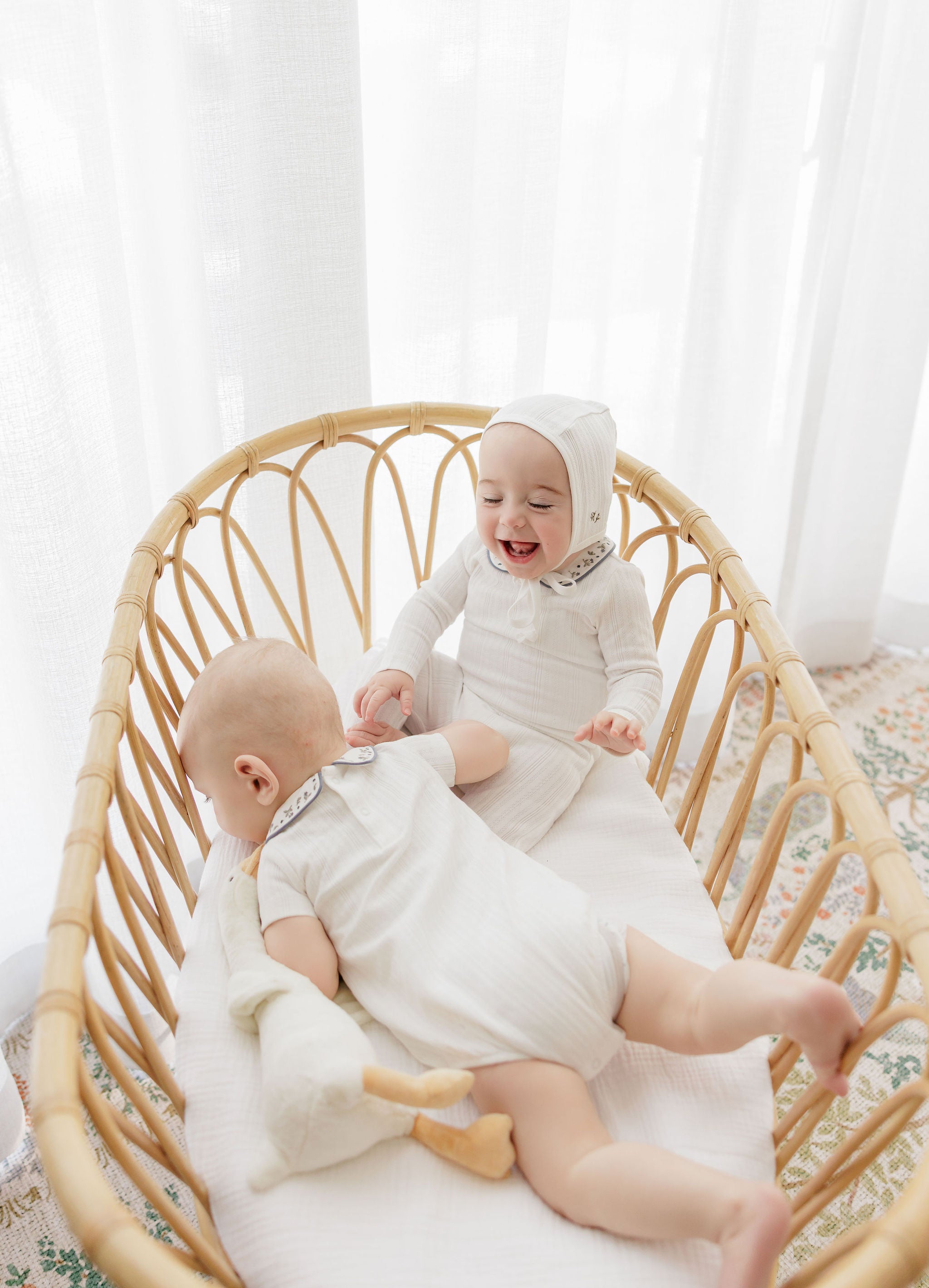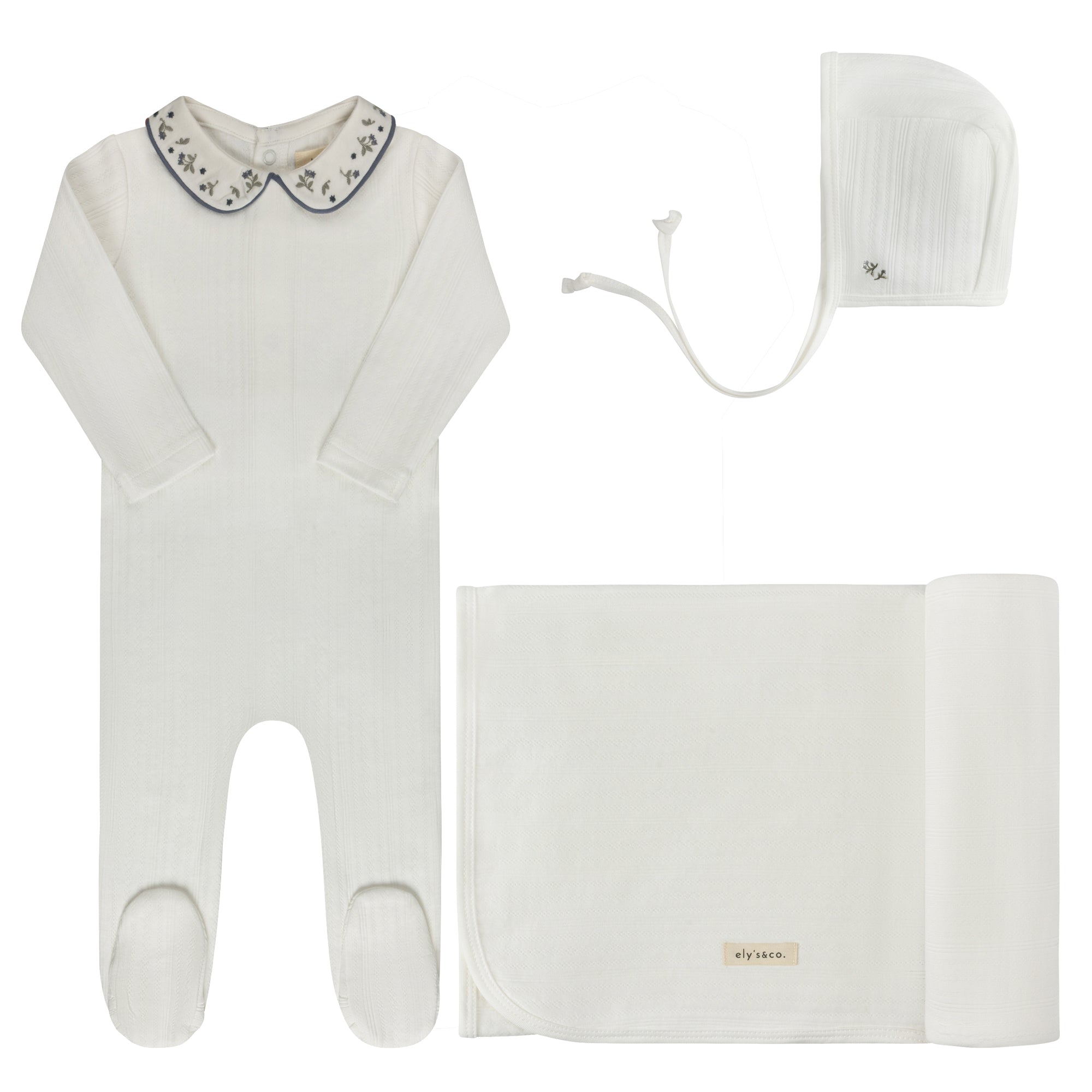 This baby layette set — the perfect take me home set — includes a coordinating footie (Stretchy), matching bonnet, and blanket.