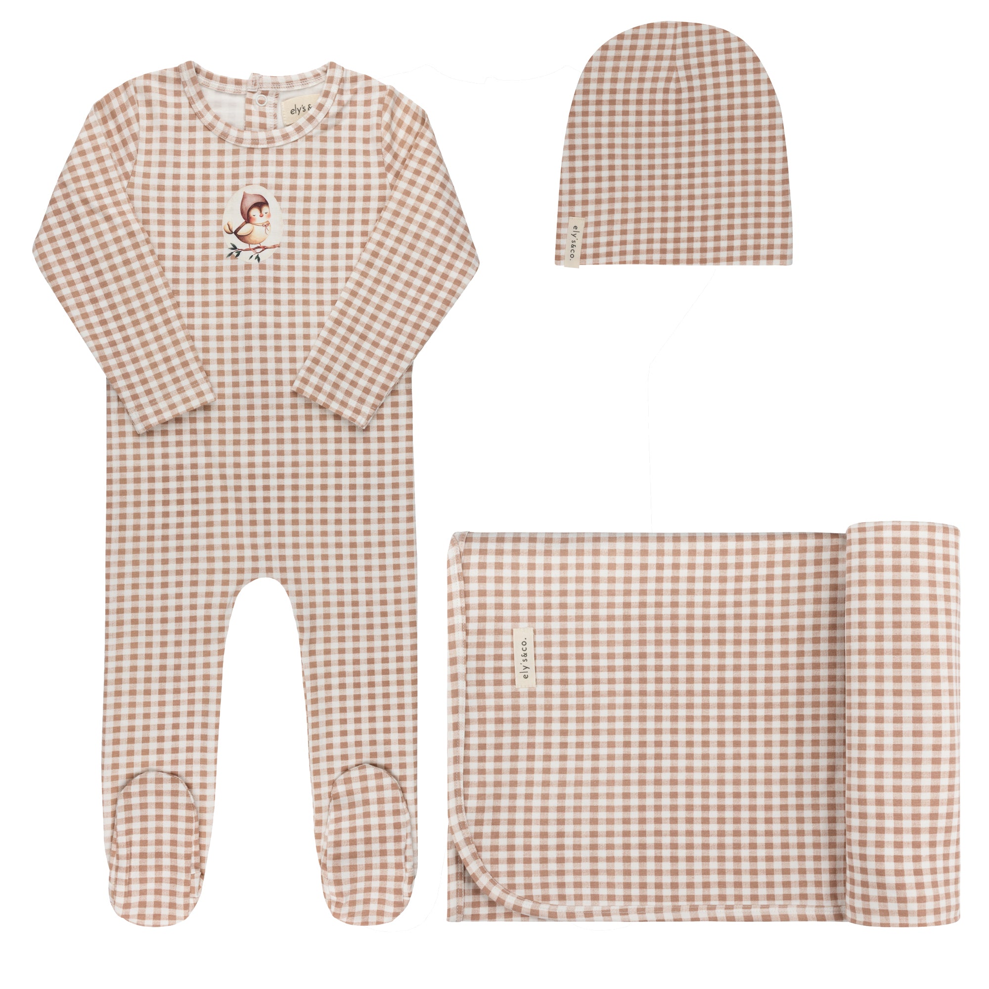 A little gingham, a little woodland charm. The Gingham Owl Collection features classic checks accented with a sweet owl patch for a look that feels both charming and effortlessly refined. Blush and sage hues make these pieces easy to mix, match, and love.