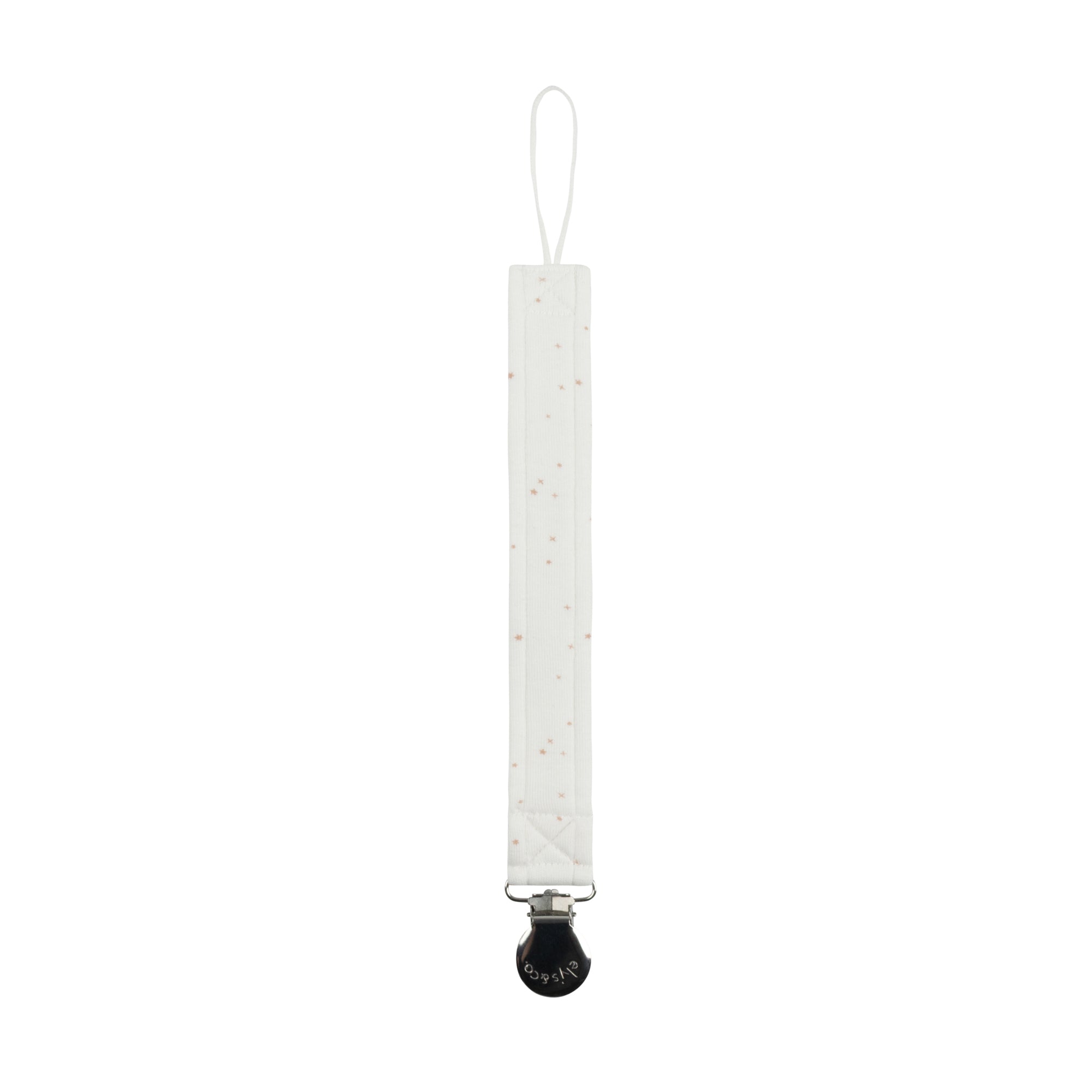 This coordinating paci clip keeps babys pacifier secure while matching perfectly with the collection.