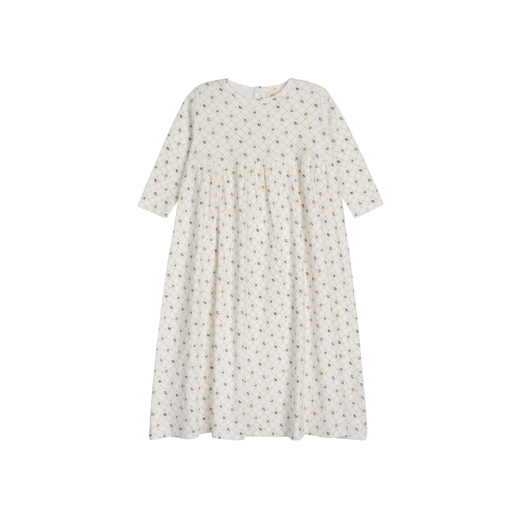 A soft ribbed dress with 3/4 sleeves in the all-over floral grid print for a sweet, seasonal look.