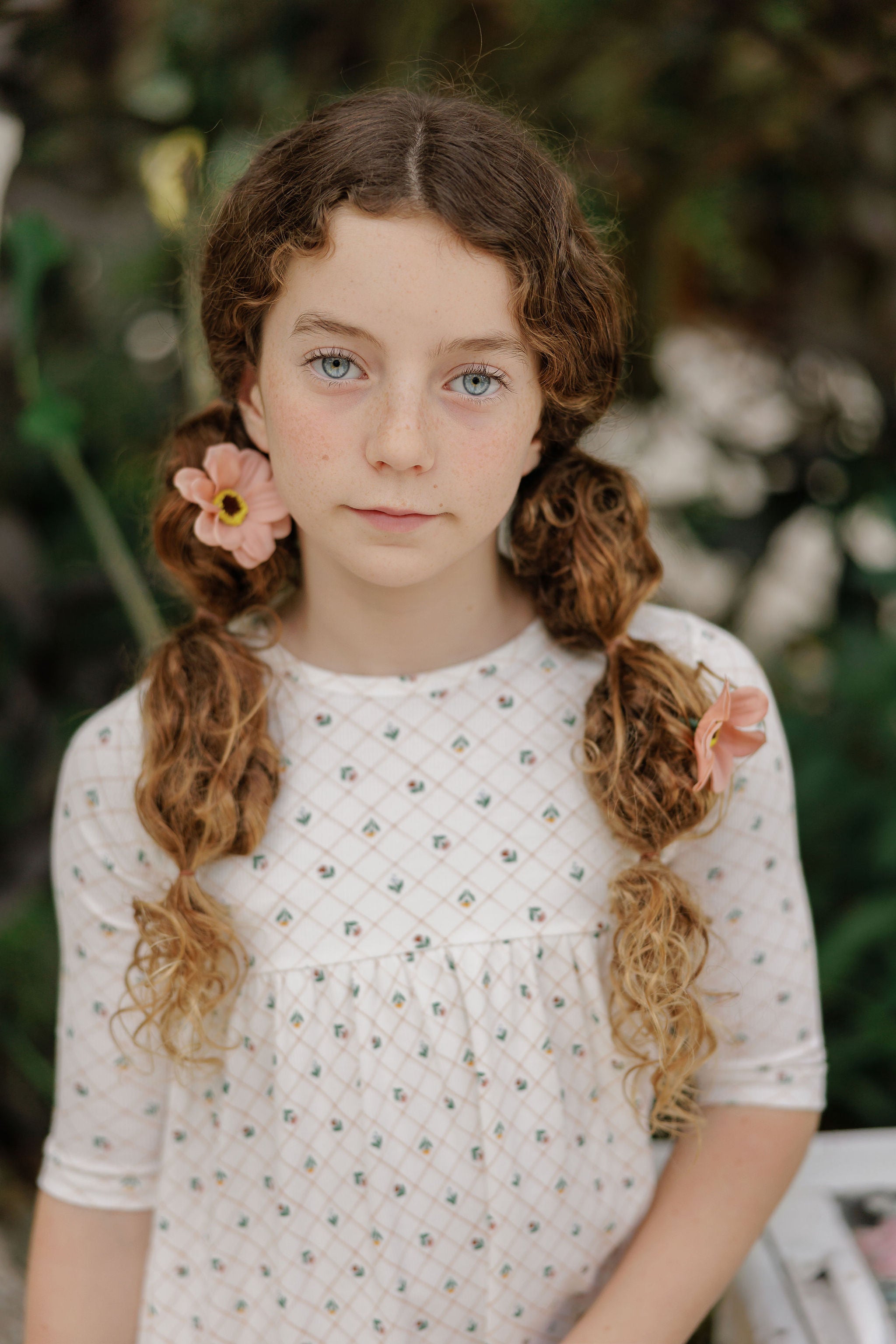 Girls Dress 3/4 Sleeves - Ivory - Floral Grid