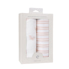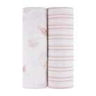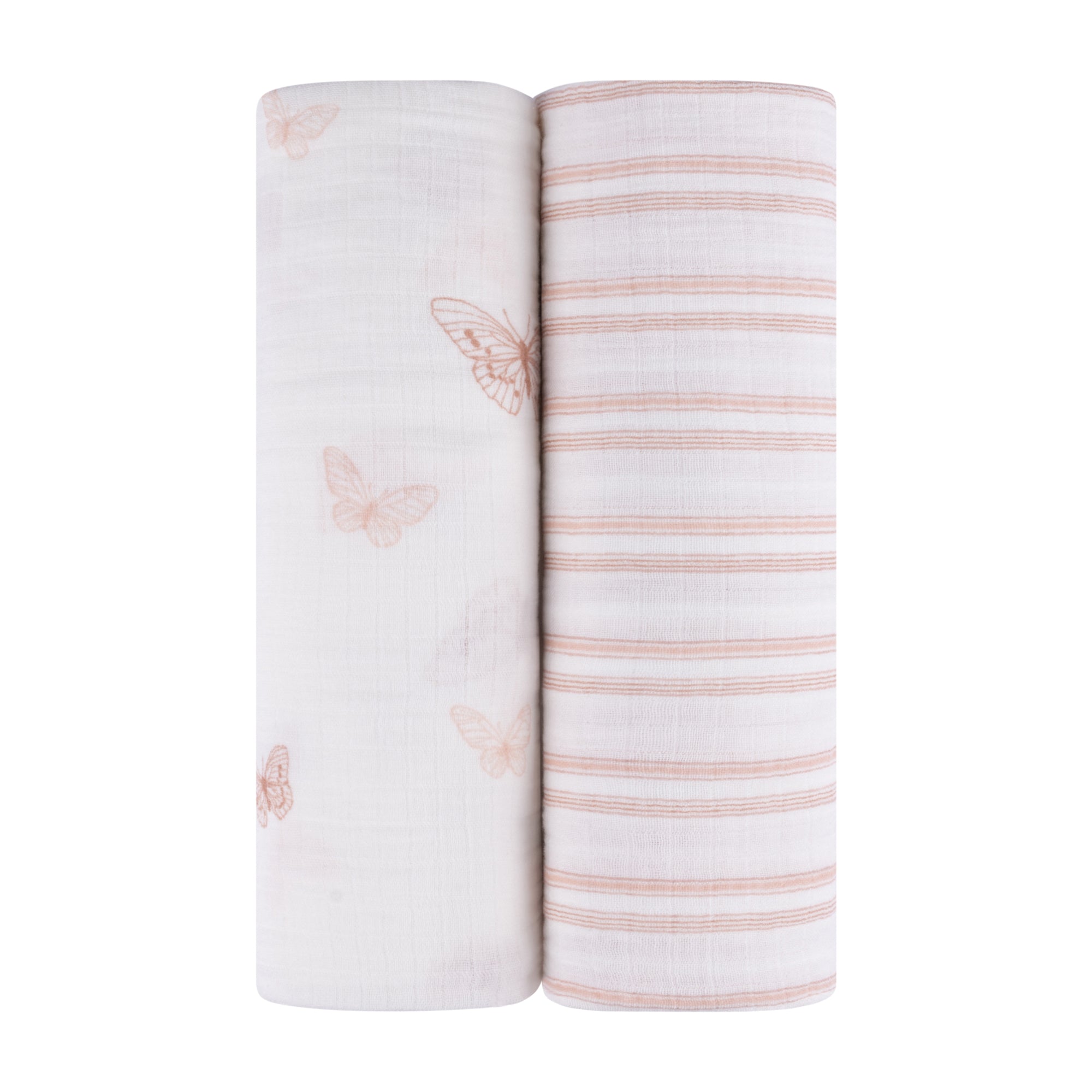 • This set features two fashionable and charming, feminine styles — an on-trend, modern butterfly print and a contemporary yet classic stripe design, both in a beautiful mauve pink color pallet. These two stylishly designed swaddle blankets bundled in our gift-ready packaging make this set a perfect baby shower present for the baby girl in your life.