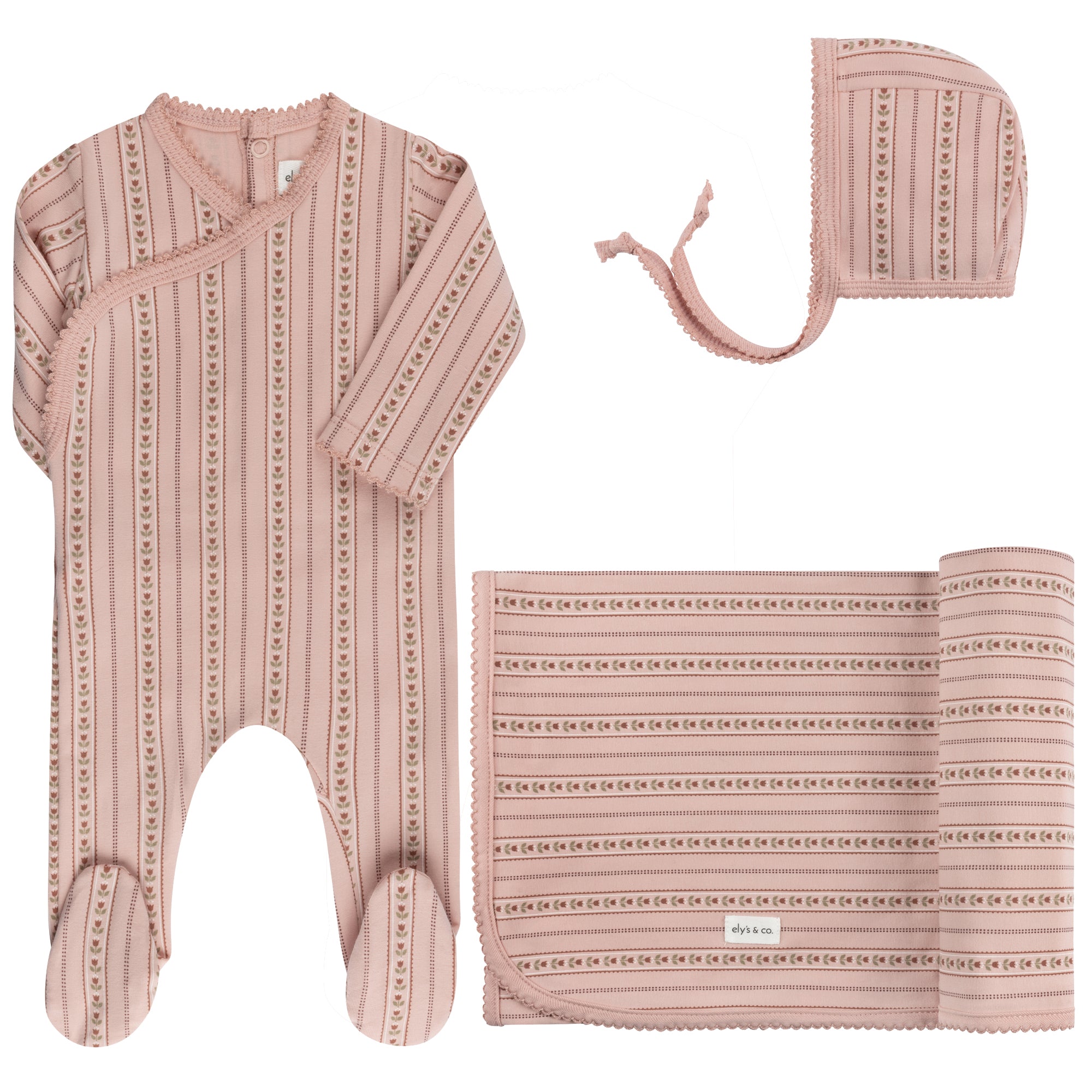 This baby layette set — the perfect take me home set — includes a coordinating kimono-style footie (Stretchy), matching bonnet, and blanket for a beautifully complete look.