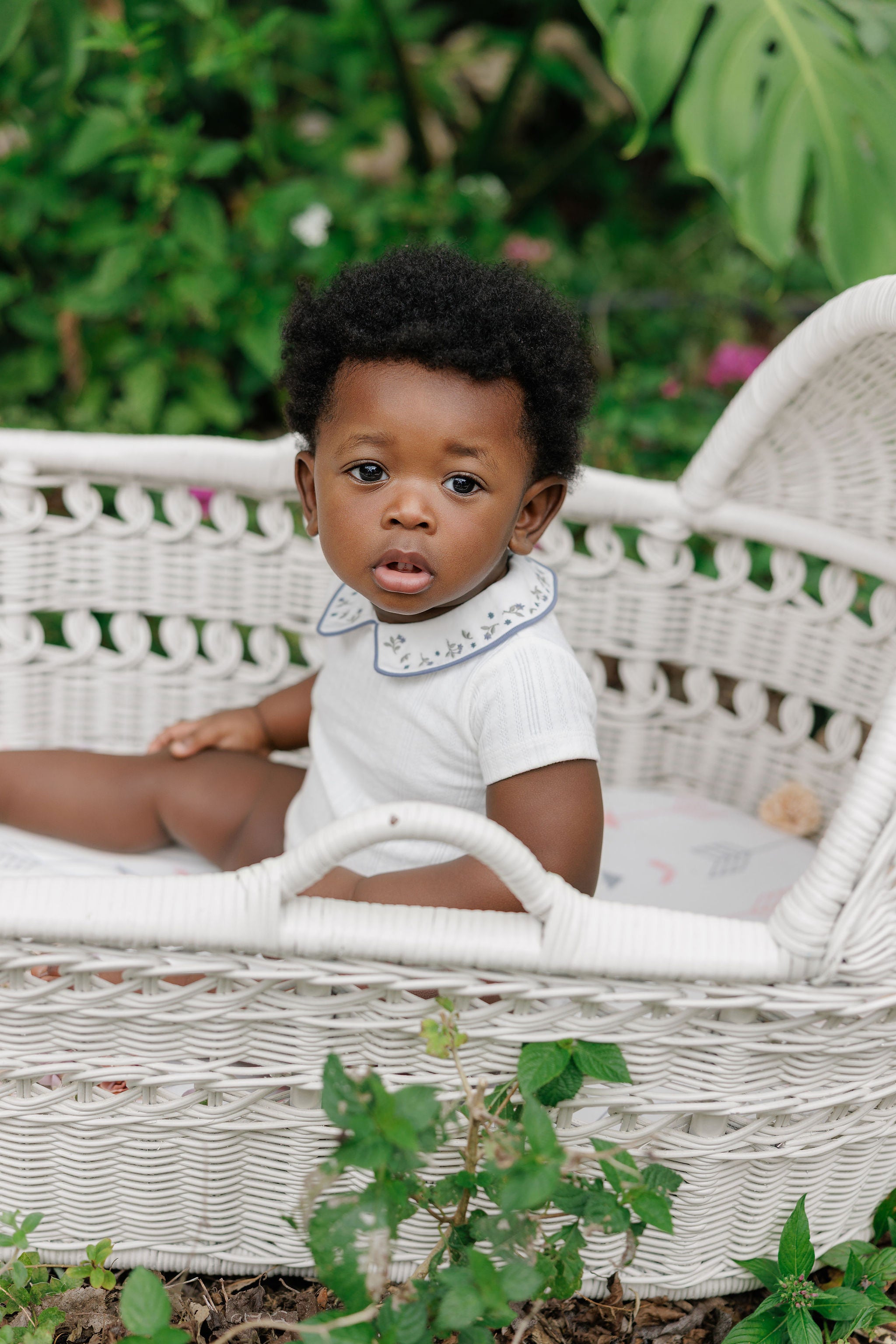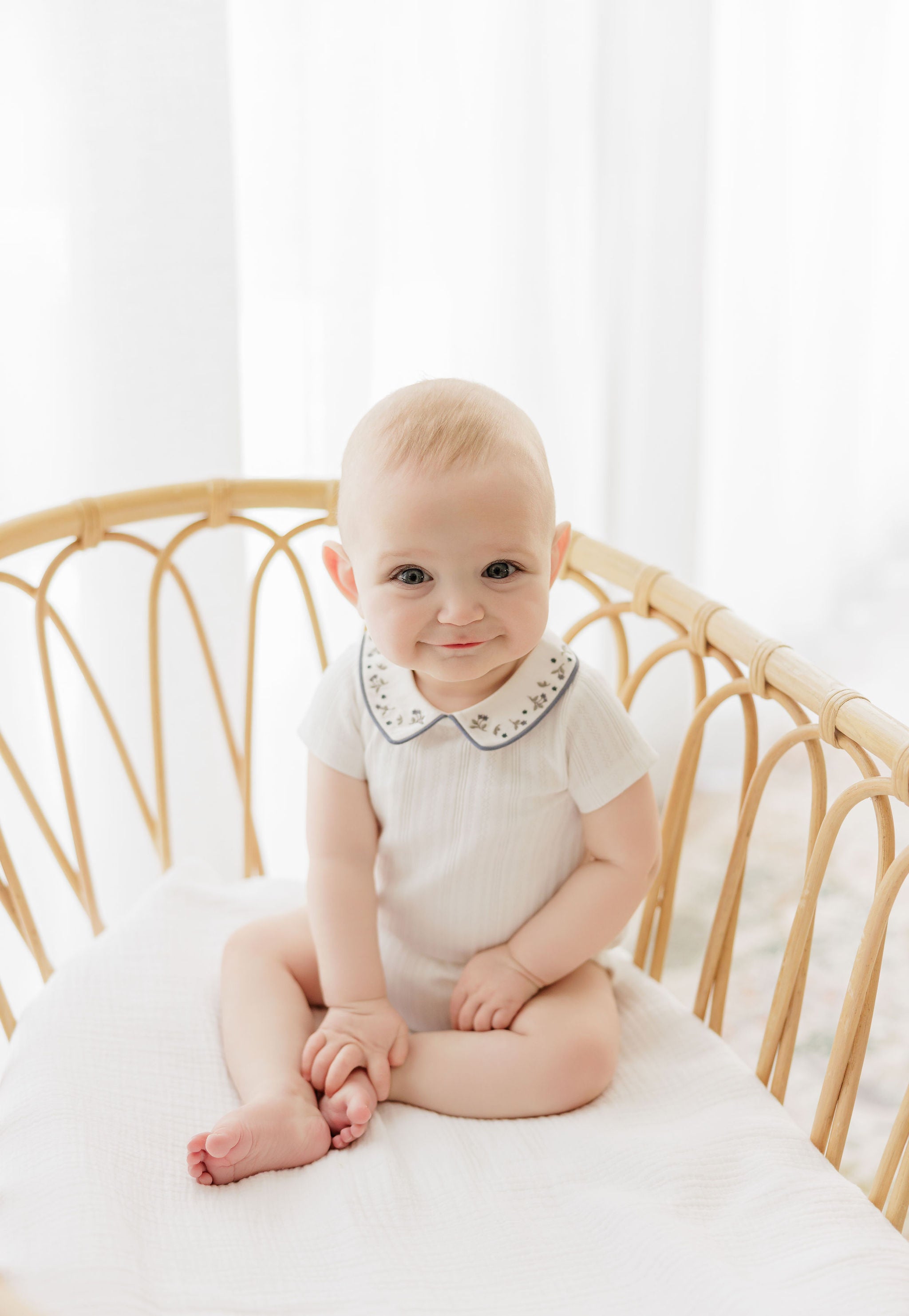 This romper features the signature embroidered collar for a timeless and polished look.