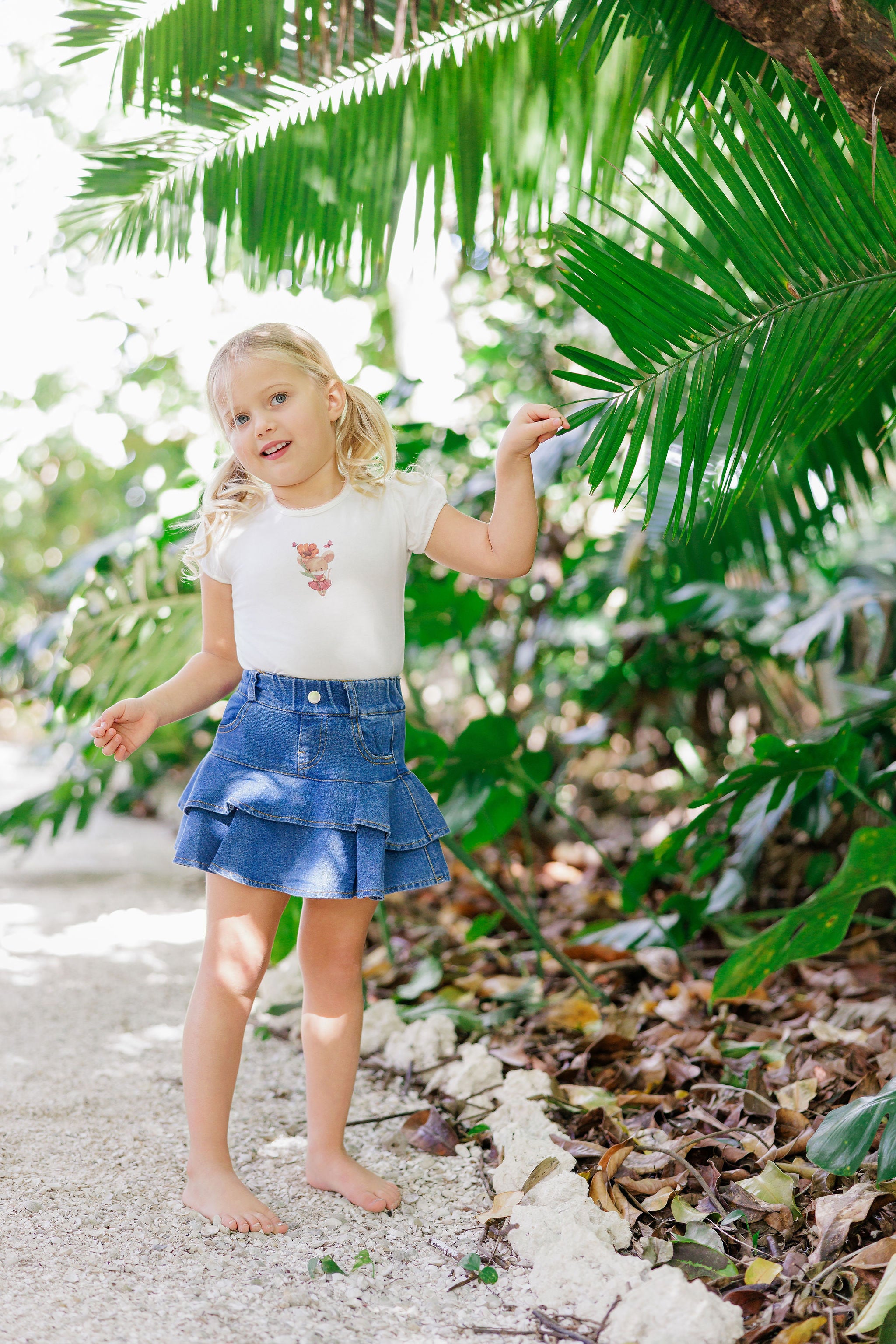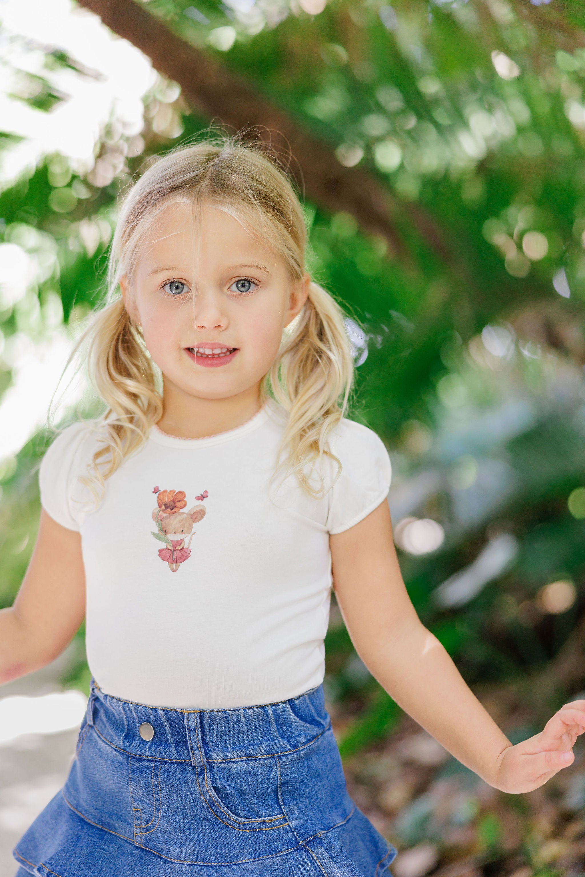 This toddler two-piece set includes a soft t-shirt and coordinating bloomers, featuring our playful mouse motif for all-day comfort.