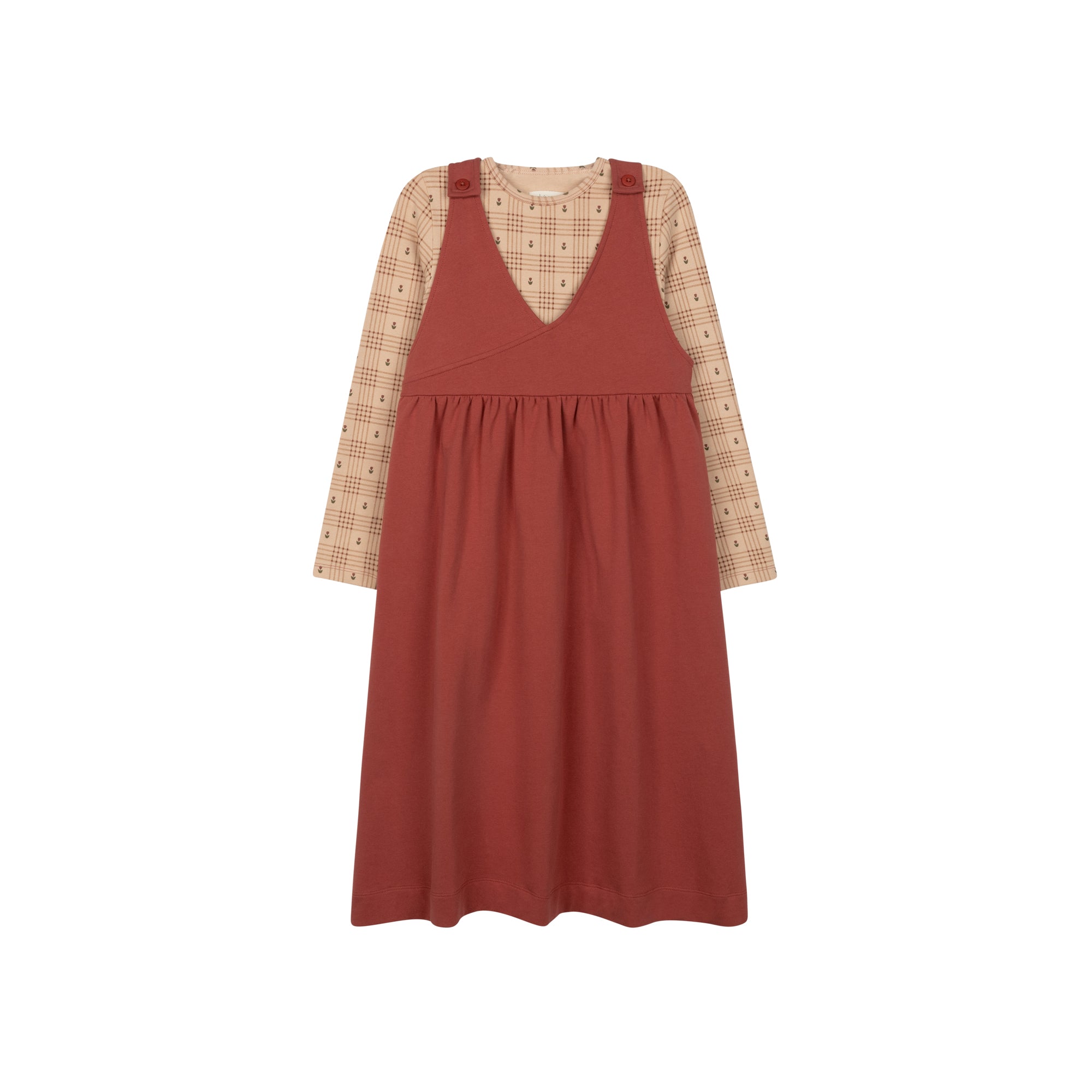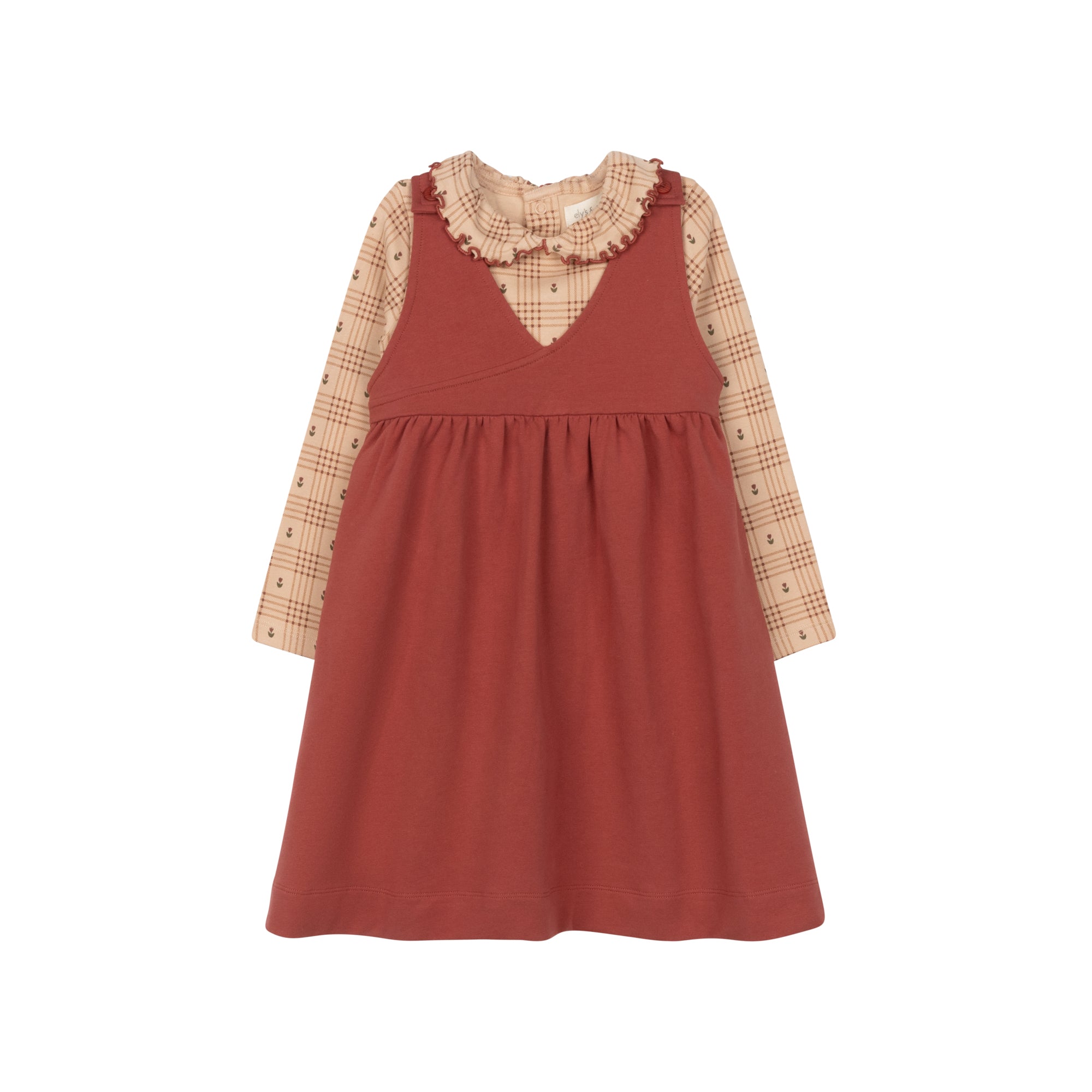 The Cotton Floral Plaid Collection Ruffle Neck Tee is perfect for every day wear.  Its soft cotton fabric and delicate ruffle neckline add a touch of sweetness to any outfit, making it a versatile wardrobe essential. Pair it with the Cotton Floral Plaid Collection Jumper to create a charming, coordinated look that's both comfortable and stylish.