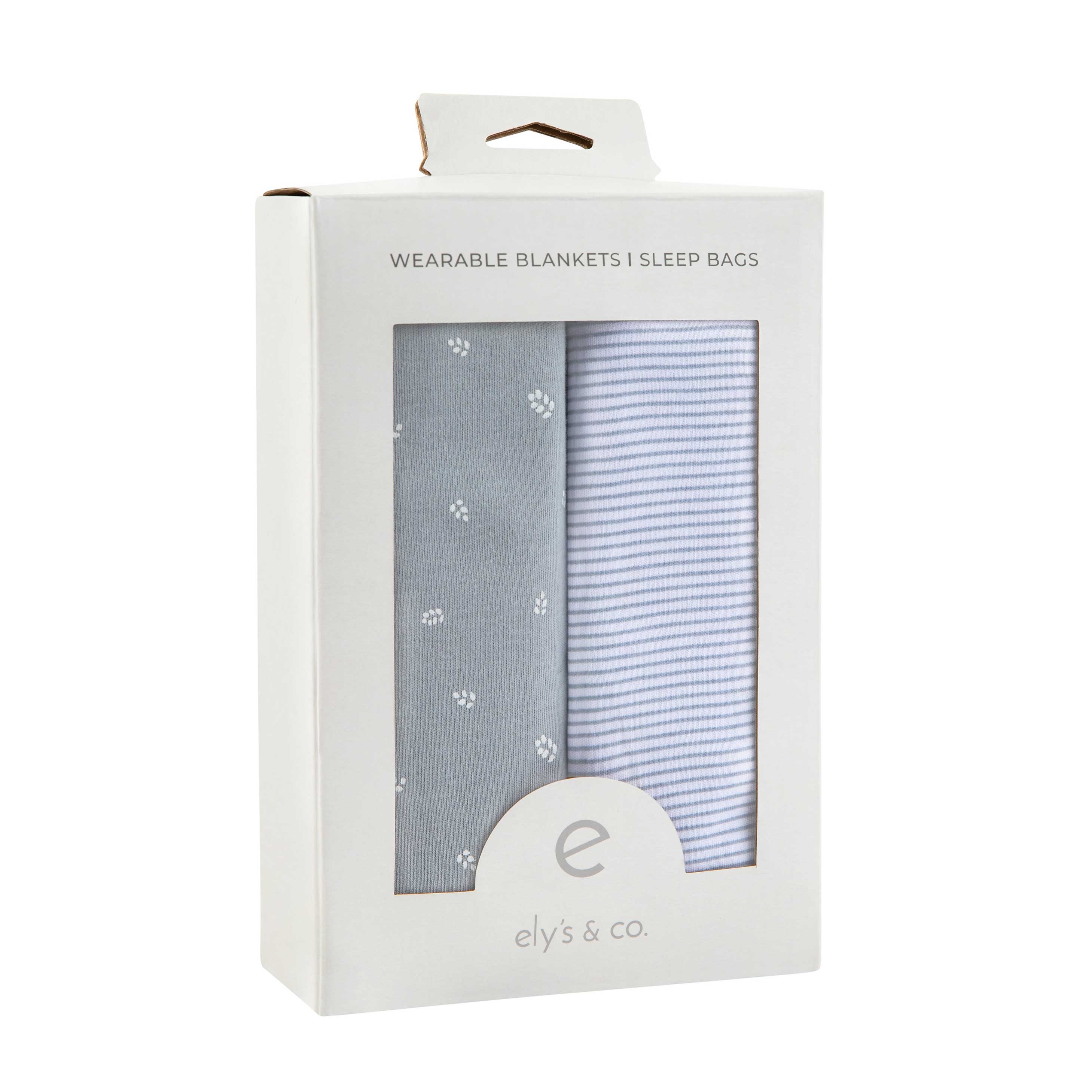 • This convenient two-pack features a super sweet leaf printed sleep bag in an earthy blue color, paired with a classic pin stripe design, made of the best interlock knit cotton. Adorably presented in a compact, gift-ready package, Ely's & Co.'s Wearable Blanket Set is undoubtedly the quintessential baby shower gift and Baby Registry must-have  for the fashion-forward, safety-conscious modern mother.