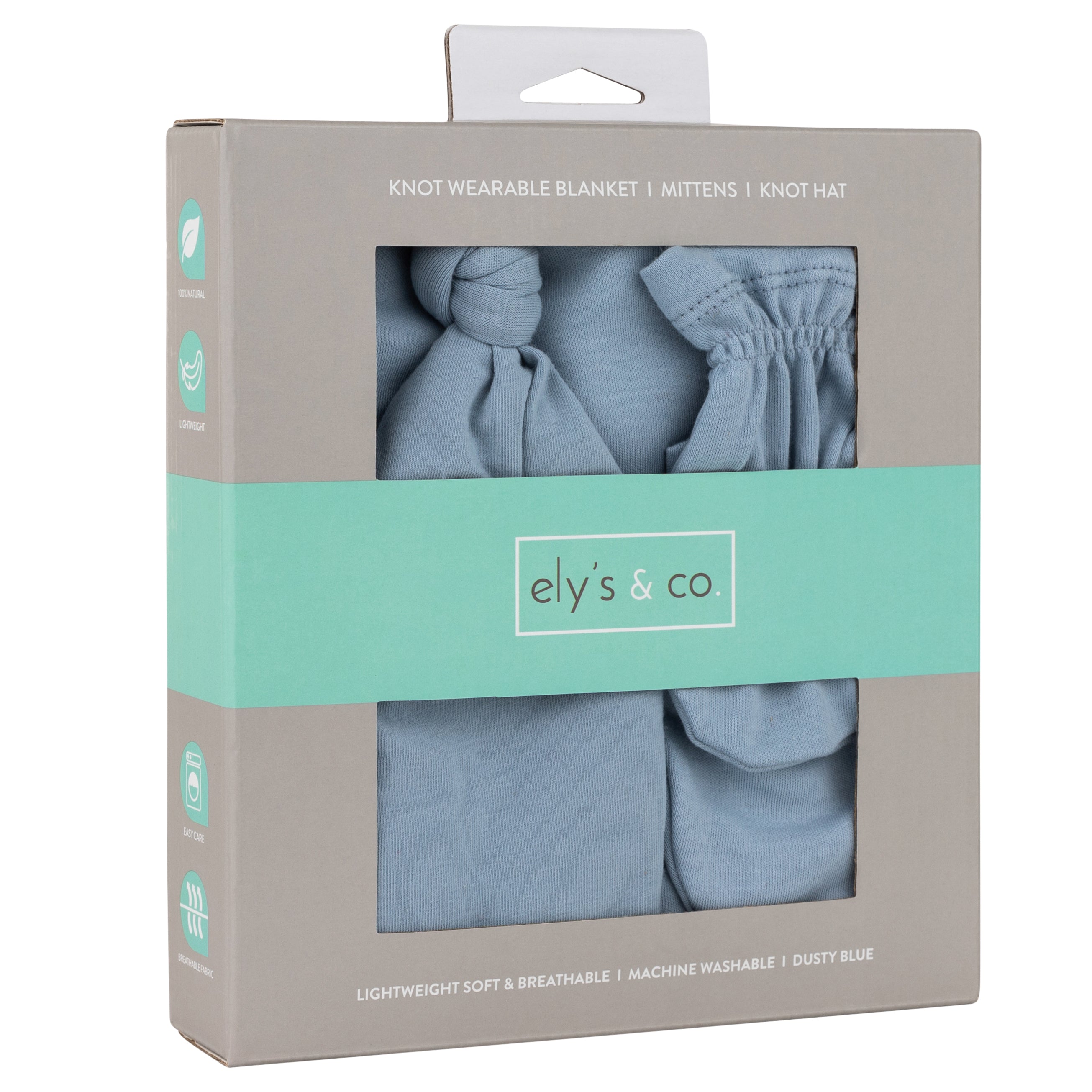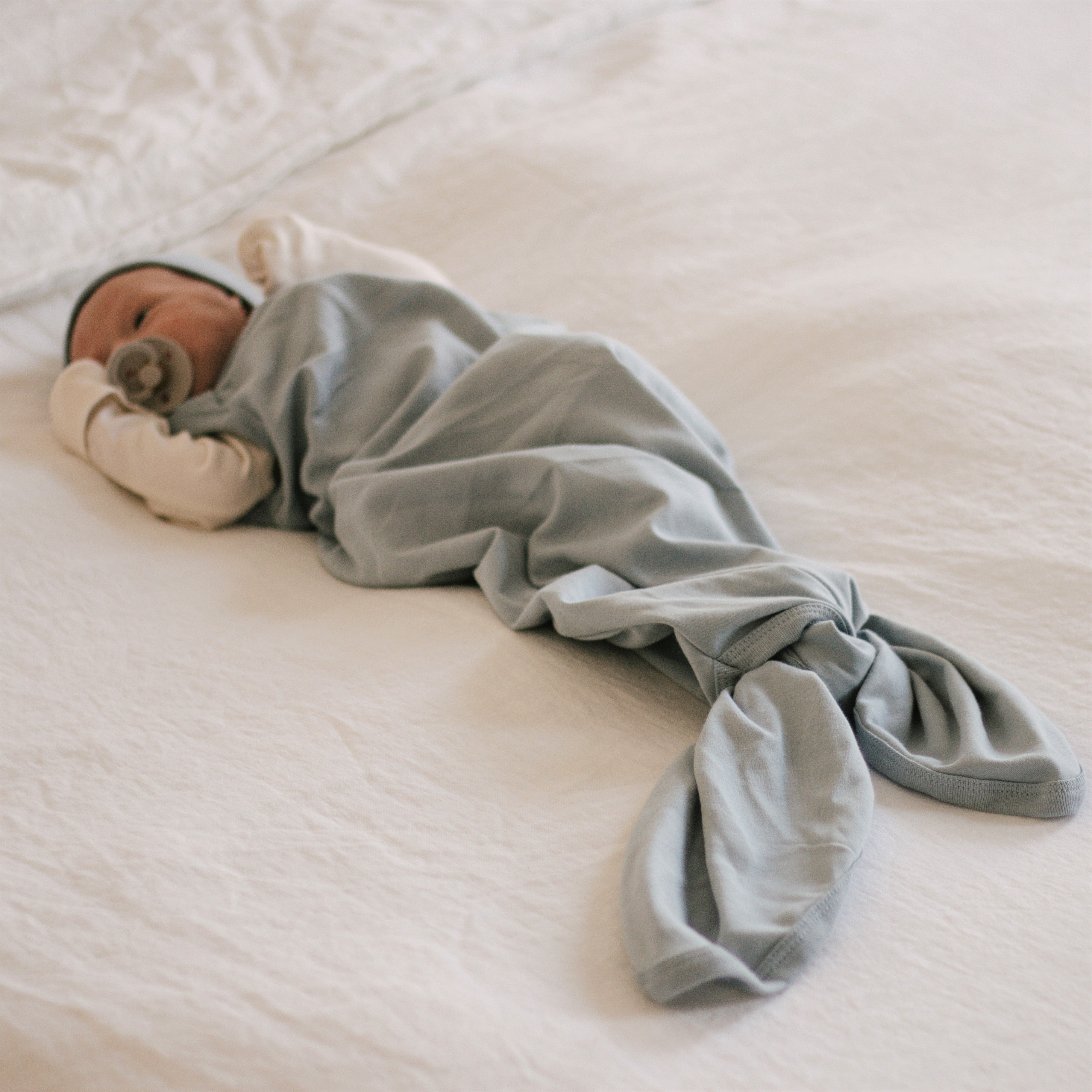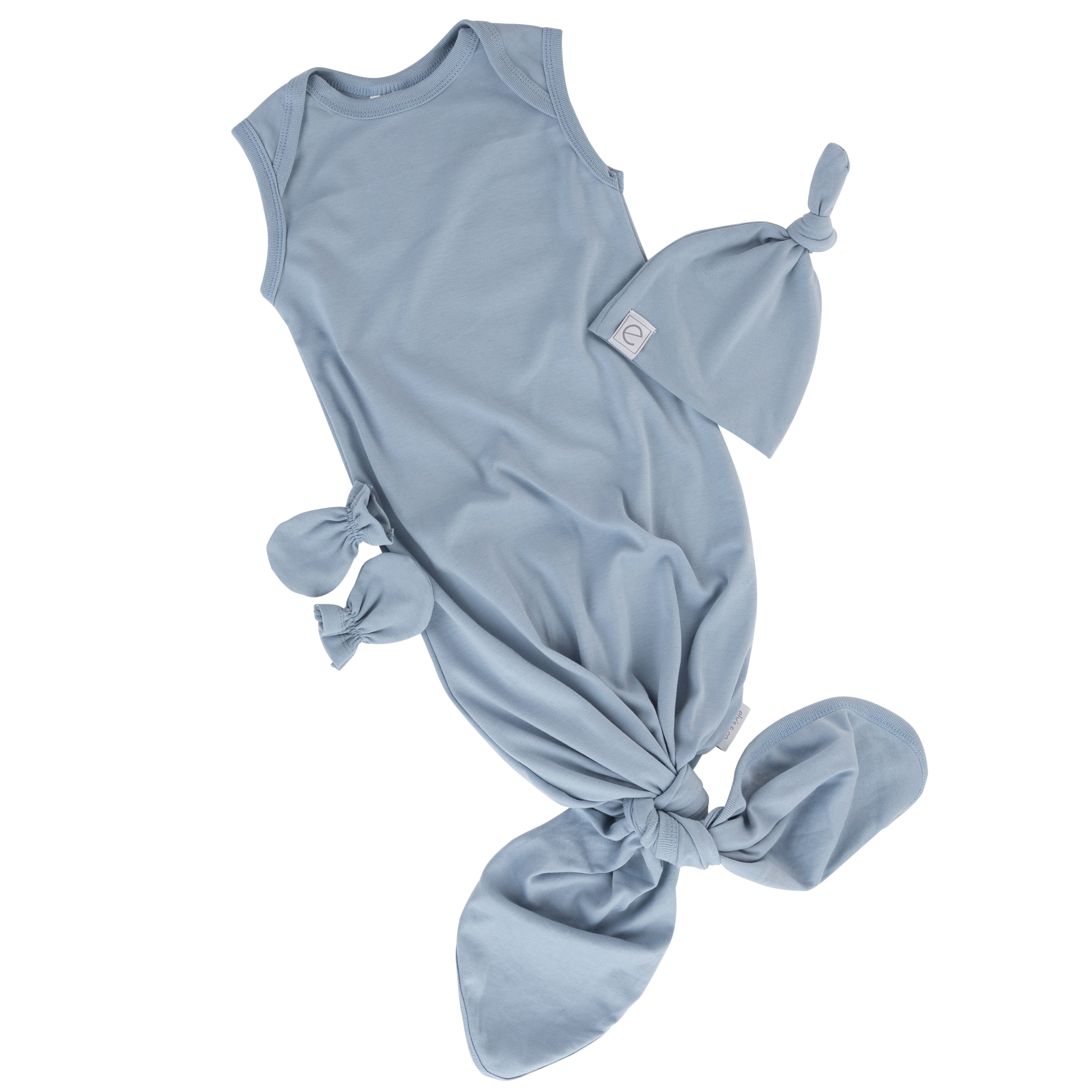 We designed a matching knot hat as well as a pair of mittens to ensure baby boy’s sensitive skin stay cozy and protected and hands are warm and snug while safeguarding their delicate skin from scratches all through the night. All in our modern and soothing shade of dusty blue, this practical and charming matching sleep set is the must-have gift for the newborn baby in your life.