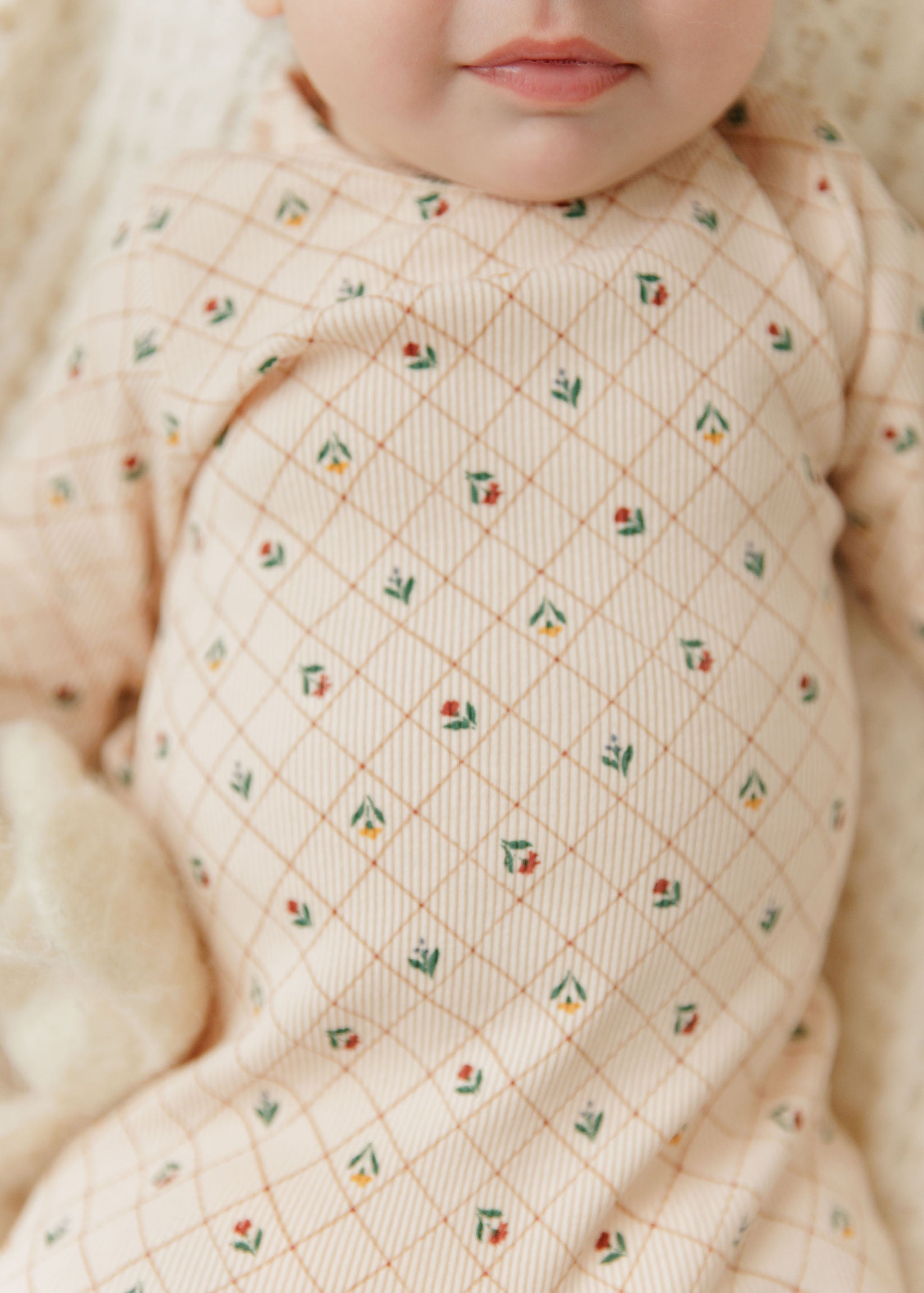 This soft ribbed baby footie (Stretchy) features the all-over floral grid print for a fresh and feminine look.