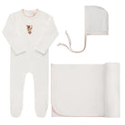 This baby layette set — the perfect take me home set — includes a coordinating footie (Stretchy), matching bonnet, and blanket for a beautifully complete look.