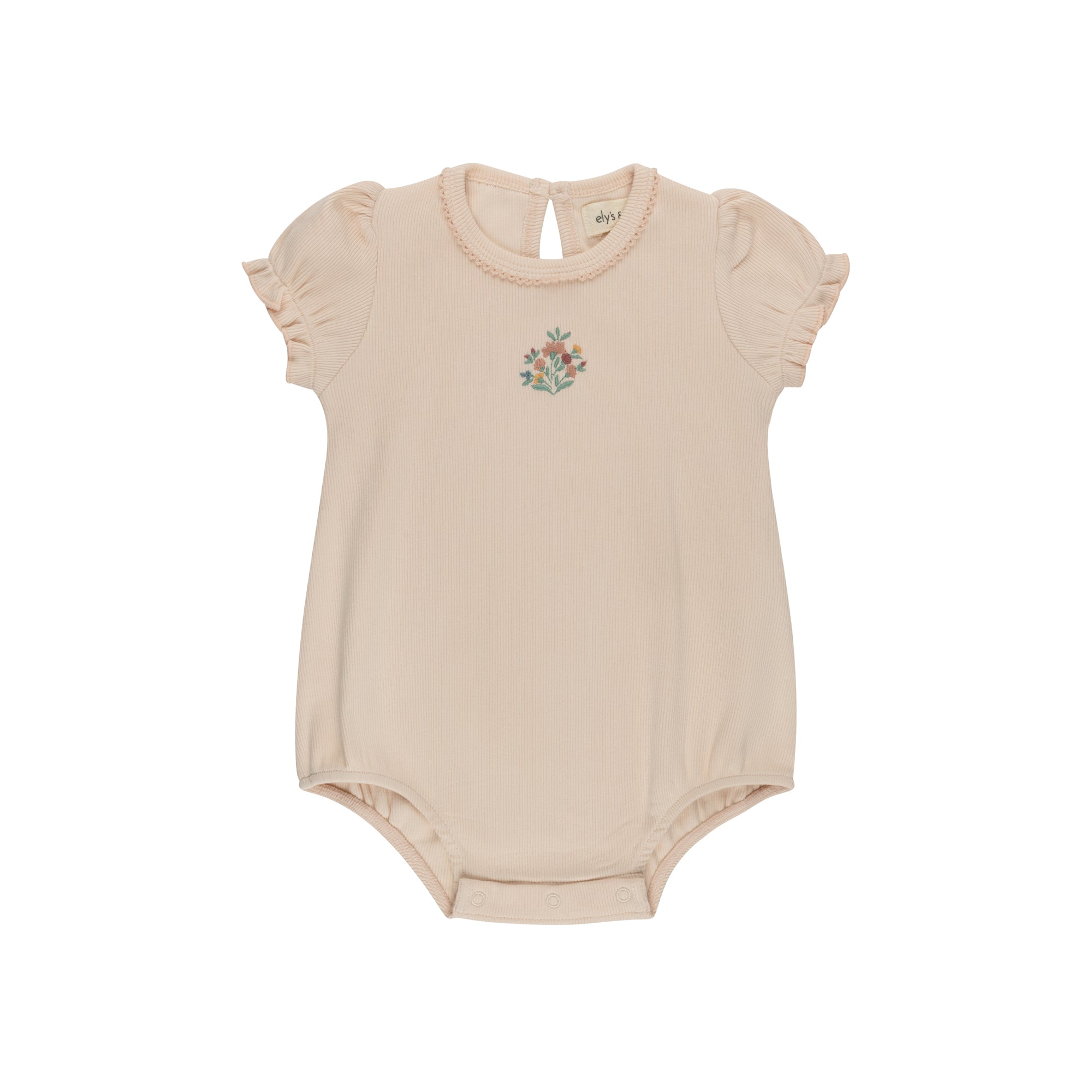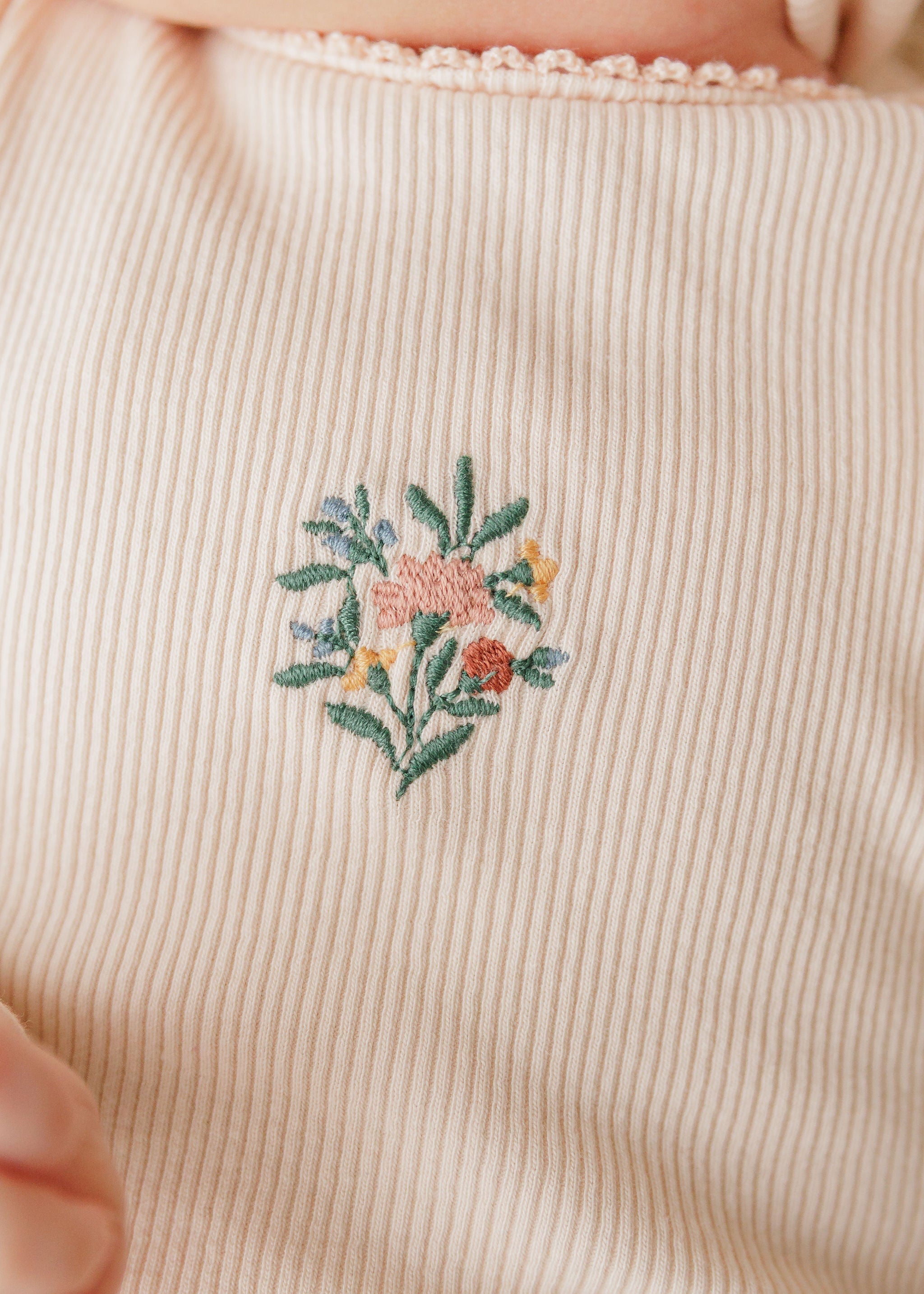 This solid ribbed romper is finished with a delicate embroidered floral bouquet for a timeless, feminine touch.