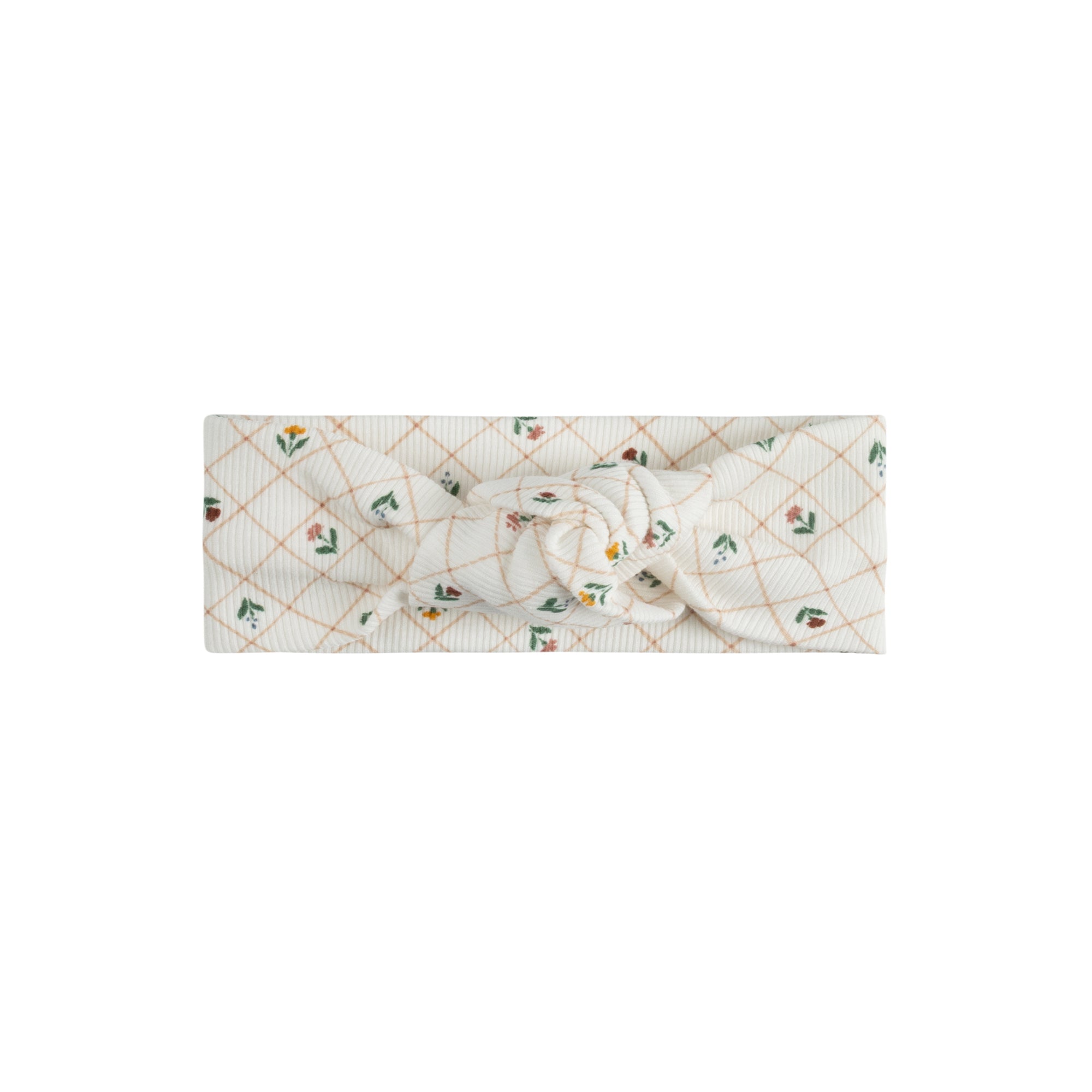 A coordinating knot headband in the all-over floral grid print for a sweet finishing touch.
