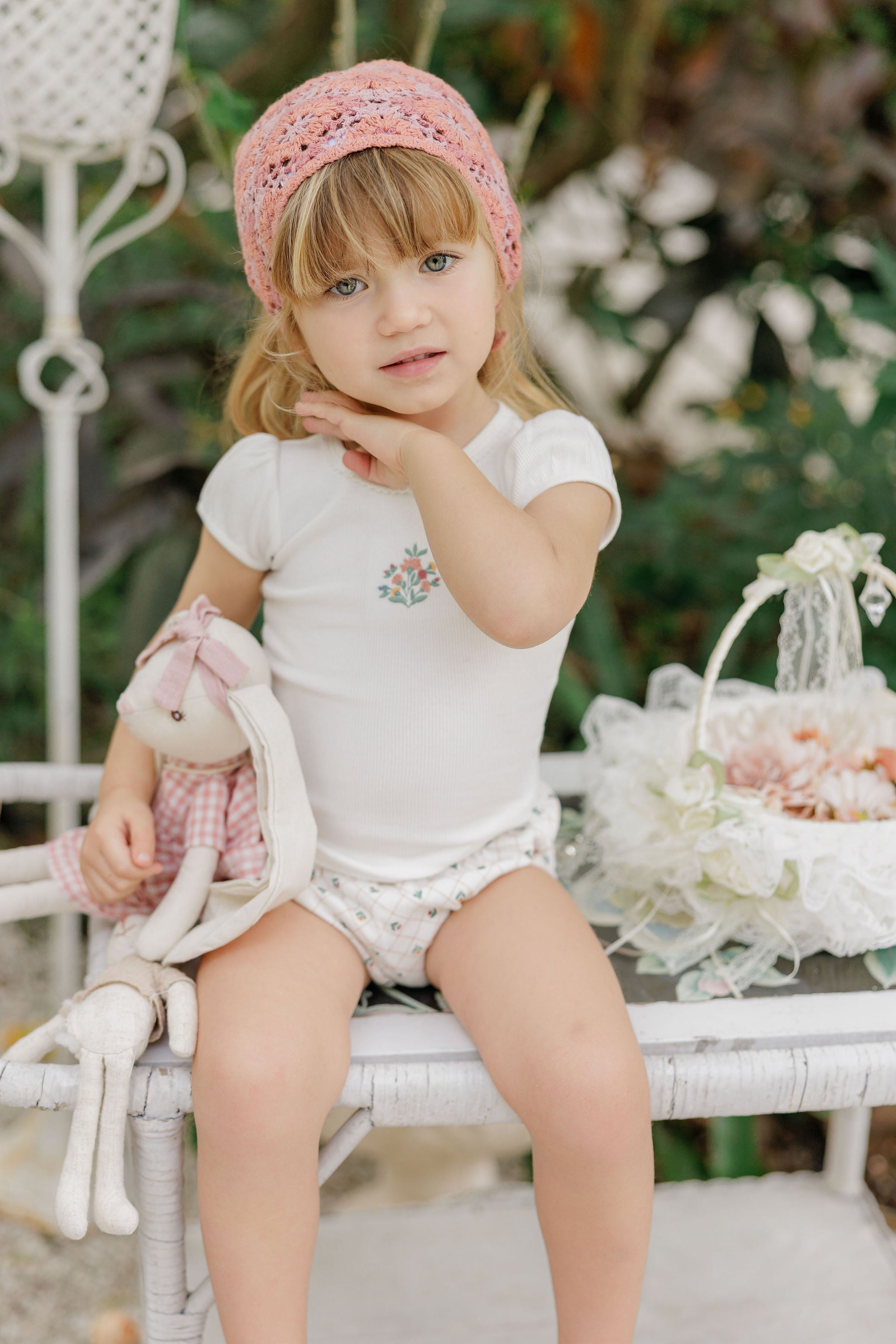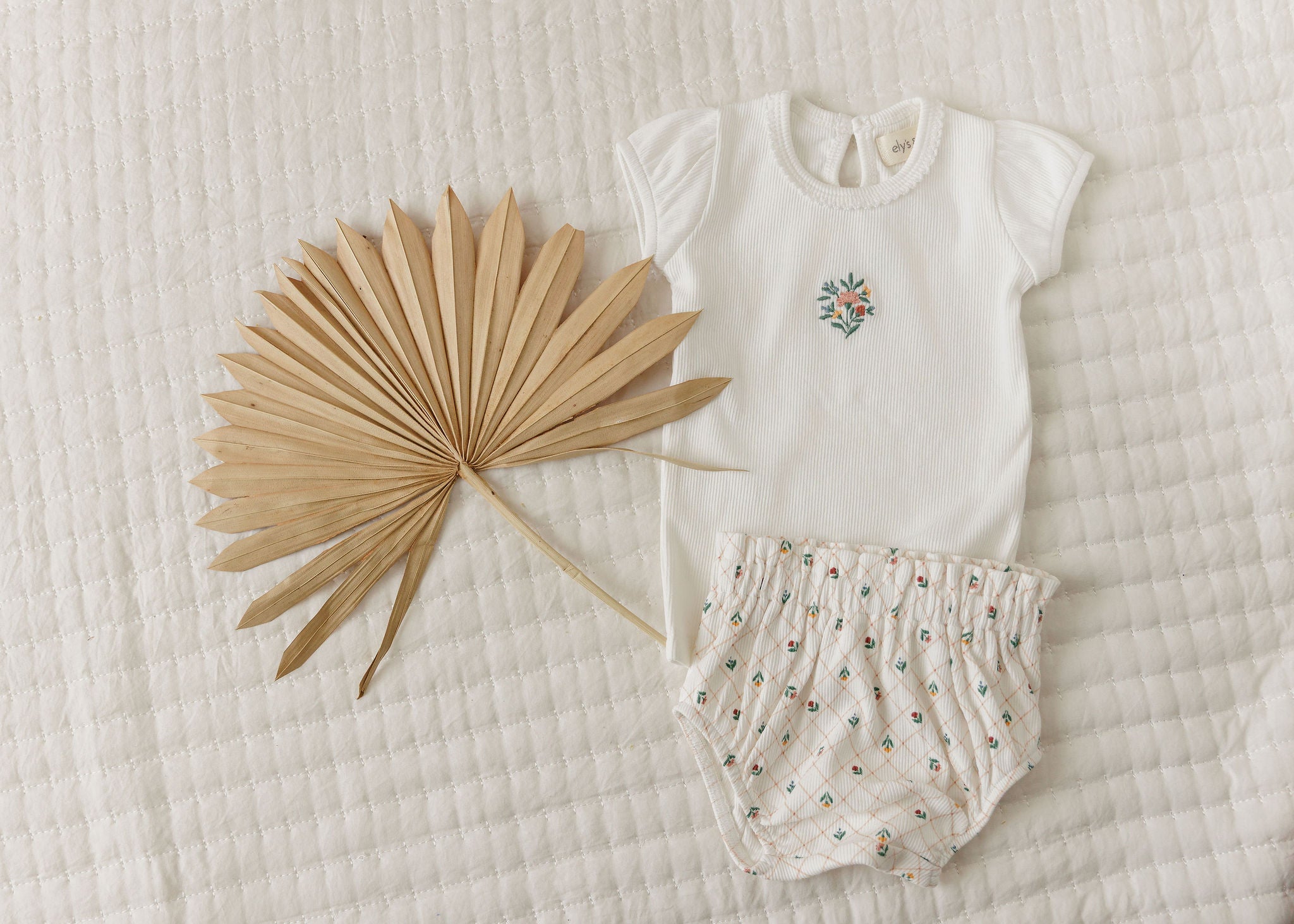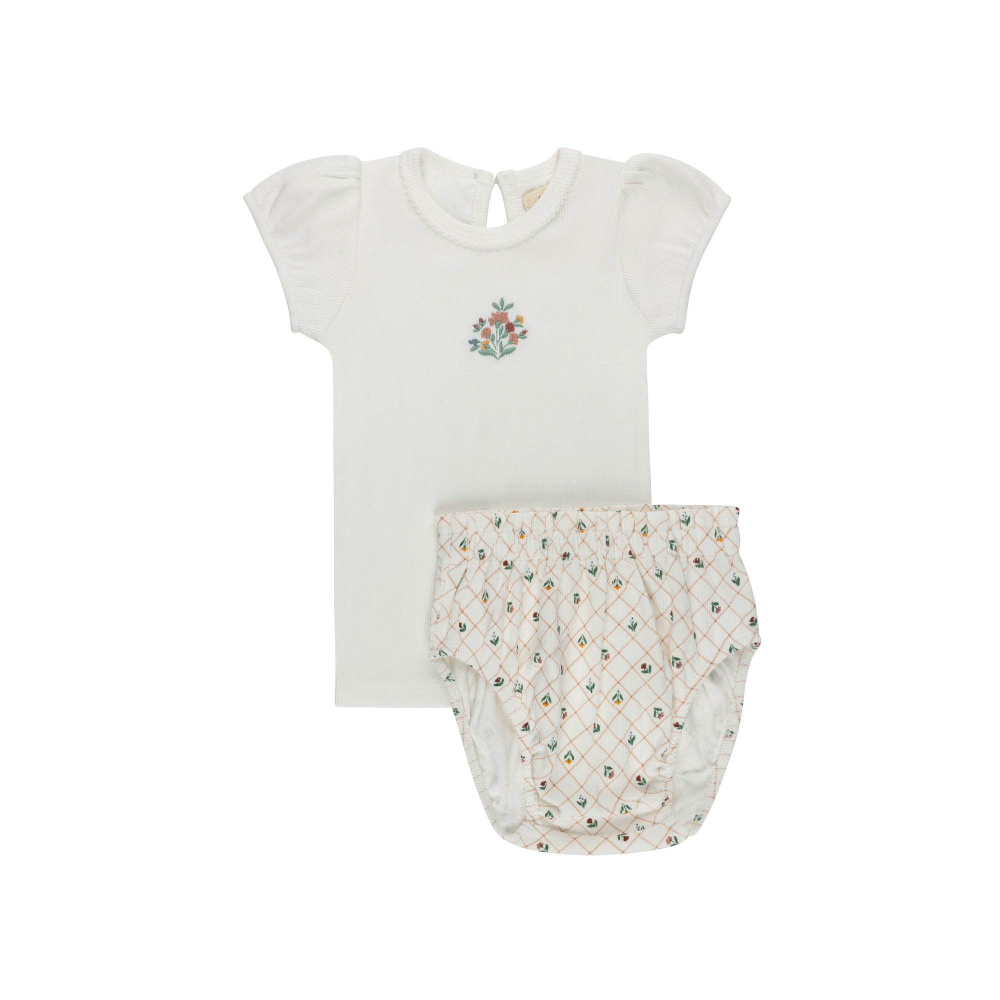 This sweet set features a solid short puff-sleeve tee with an embroidered floral bouquet, paired with coordinating bloomers in the all-over floral grid print.