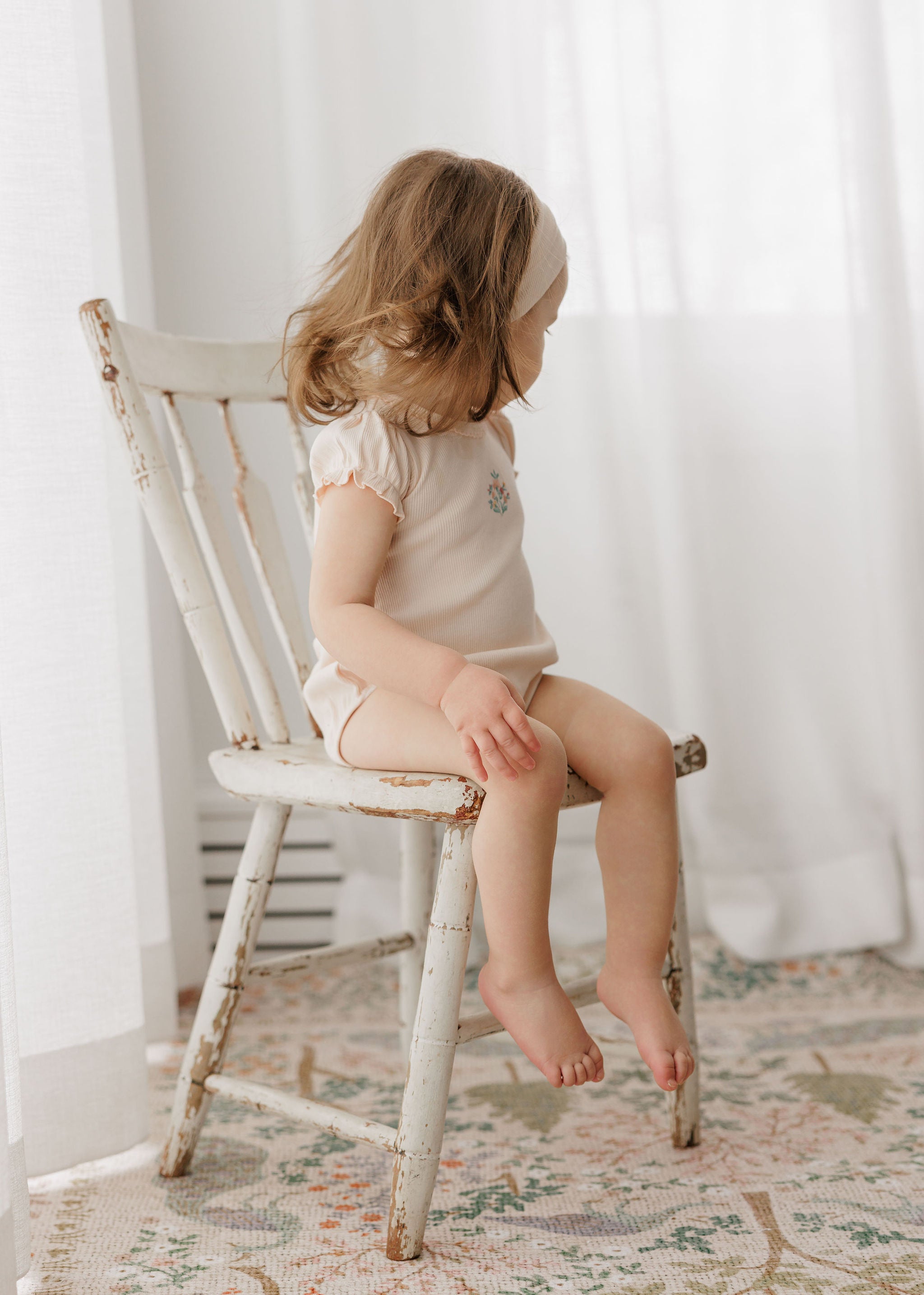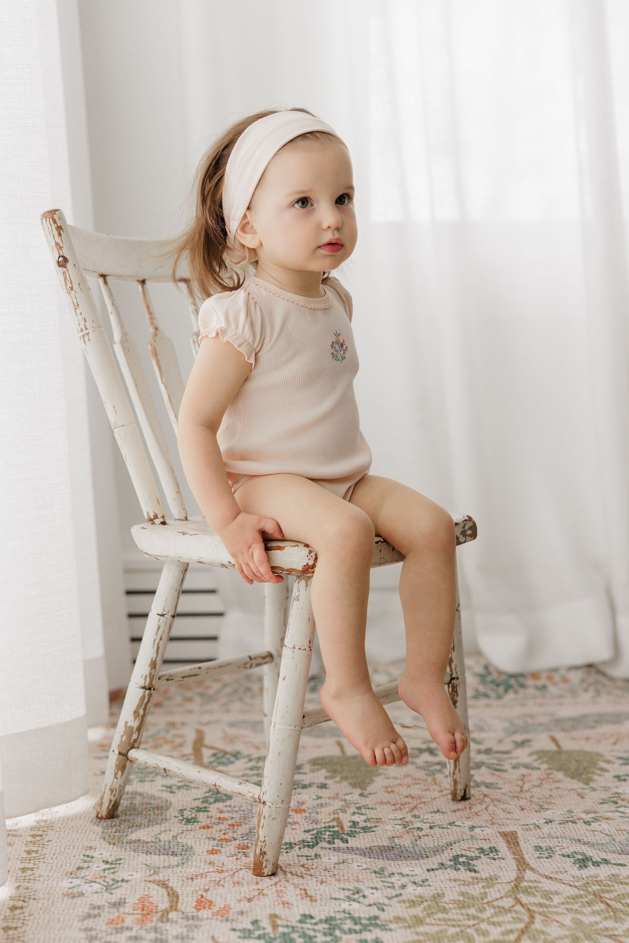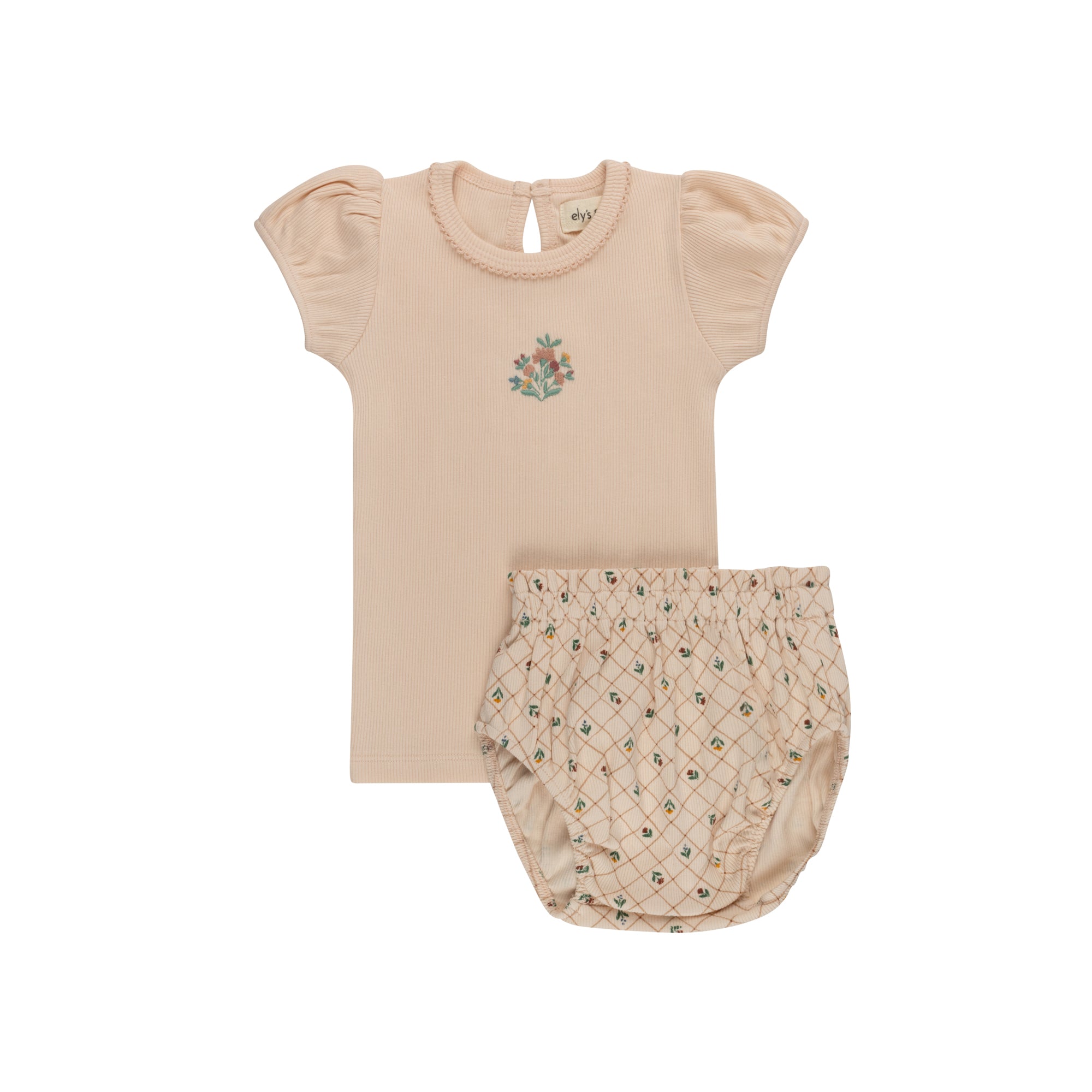 This sweet set features a solid short puff-sleeve tee with an embroidered floral bouquet, paired with coordinating bloomers in the all-over floral grid print.